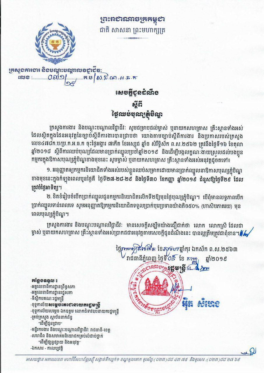 ក្រសួងការងារដាស់តឿនម្ចាស់សហគ្រាសនូវច្បាប់ថ្ងៃសម្រាកបុណ្យភ្ជុំ