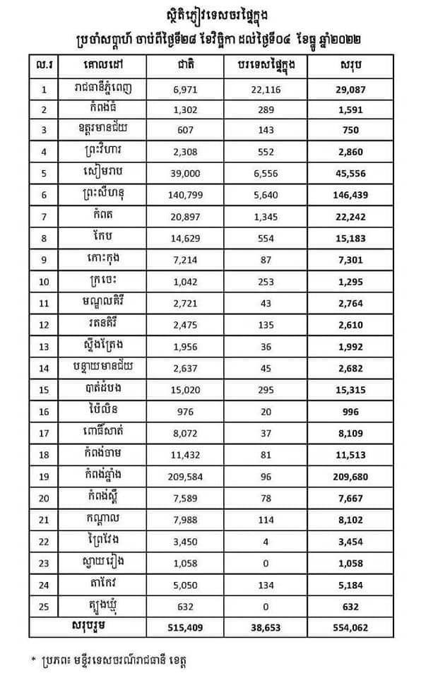 ភ្នំពេញ៖ ចាប់ពីថ្ងៃទី២៨ ខែវិច្ឆិកា ដល់ថ្ងៃទី៤ ខែធ្នូ ២០២២ នៅទូទាំងប្រទេសទទួលបានភ្ញៀវសរុប៥៥៤,០៦២នាក់ ក្នុងនោះភ្ញៀវជាតិ៥១៥,៤០៩នាក់ និងភ្ញៀវបរទេសផ្ទៃក្នុង៣៨,៦៥៣នាក់។ តួលេខនេះមានកំណើន ៤៩.៩៨% ធៀបនឹងសប្តាហ៍កន្លងមក។