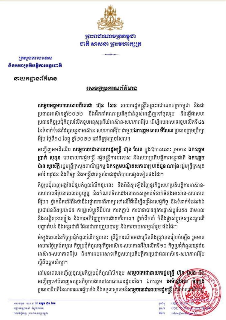 ភ្នំពេញ៖ សម្តេចអគ្គមហាសេនាបតីតេជោ ហ៊ុន សែន នាយករដ្ឋមន្ត្រីនៃព្រះរាជាណាចក្រកម្ពុជា និងជា ប្រធានអាស៊ានឆ្នាំ២០២២ នឹងដឹកនាំគណៈប្រតិភូជាន់ខ្ពស់អញ្ជើញទៅ ចូលរួម និងធ្វើជាសហប្រធានកិច្ចប្រជុំកំពូលរំលឹកខួបអនុស្សាវរីយ៍អាស៊ាន-សហភាពអឺរ៉ុប ដើម្បីអបអរសាទរខួបលើកទី៤៥ នៃទំនាក់ទំនង ដៃគូសន្ទនាអាស៊ាន-សហភាពអឺរ៉ុប ជាមួយឯកឧត្តម ឆាល មីសែល ប្រធានក្រុមប្រឹក្សា អឺរ៉ុប ថ្ងៃទី១៤ ខែធ្នូ ឆ្នាំ២០២២ នៅទីក្រុងព្រុចសែល។ នេះបេីយោងតាមសេចក្តីប្រកាសព័ត៌មានរបស់ក្រសួងការបរទេស និងសហប្រតិបត្តិការអន្តរជាតិ កាលពីថ្ងៃទី៩ ខែធ្នូ ឆ្នាំ២០២២។