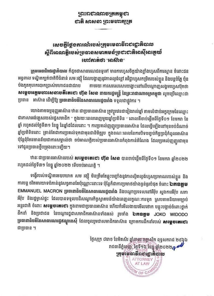 ភ្នំពេញៈ ក្រុមមេធាវីរាជរដ្ឋាភិបាល ក៏ដូចជាសាធារណជនទូទៅ មានការហួសចិត្តយ៉ាងខ្លាំងហួសពីការស្មានចំពោះជនអន្ធពាលទណ្ឌិតក្បត់ជាតិបីជំនាន់ សម រង្ស៊ី ដែលបង្ហាញនូវភាពល្ងង់ខ្លៅ អវិជ្ជាហួសកម្រិតរបស់ខ្លួន និងបន្តបំភ្លៃ ប៉ុនប៉ងភូតកុហកបោកប្រាស់មហាជនជាដរាប តាមរយៈការសរសេរសារបង្ហោះនៅលើបណ្ដាញសង្គមហ្វេសប៊ុកថា សម្តេចអគ្គមហាសេនាបតីតេជោ ហ៊ុន សែន នាយករដ្ឋមន្ដ្រី នៃព្រះរាជាណាចក្រកម្ពុជា លួចប្រើឈ្មោះជាប្រធានអាស៊ាន ដើម្បីឱ្យប្រធានាធិបតីនៃសាធារណរដ្ឋបារាំង ទទួលជាផ្លូវការ។ នេះបើយោងតាមសេចក្តីថ្លែងការណ៍របស់ក្រុមមេធាវីរាជរដ្ឋាភិបាល ស្តីពីអាណត្តិរបស់ប្រធានសមាគមន៍ប្រជាជាតិអាស៊ីអាគ្នយ៍ ហៅកាត់ថា “អាស៊ាន” នៅថ្ងៃទី១៦ ខែធ្នូ ឆ្នាំ២០២២ ។