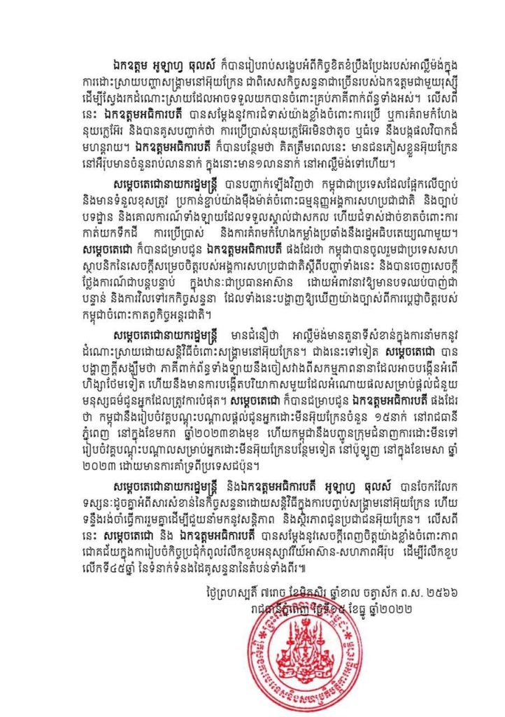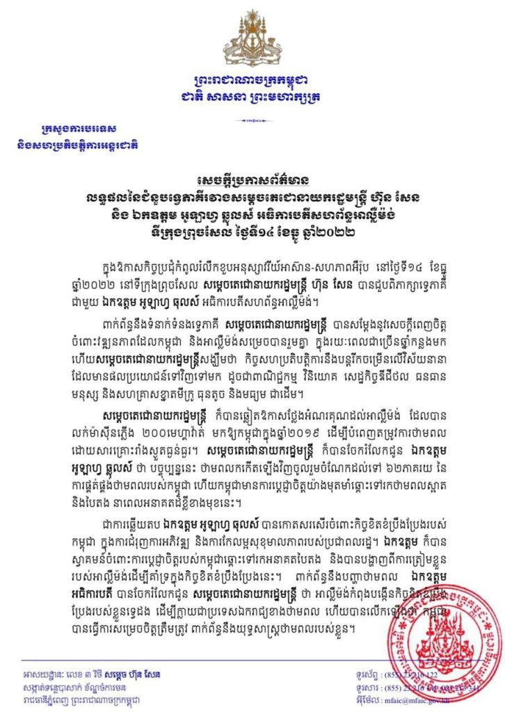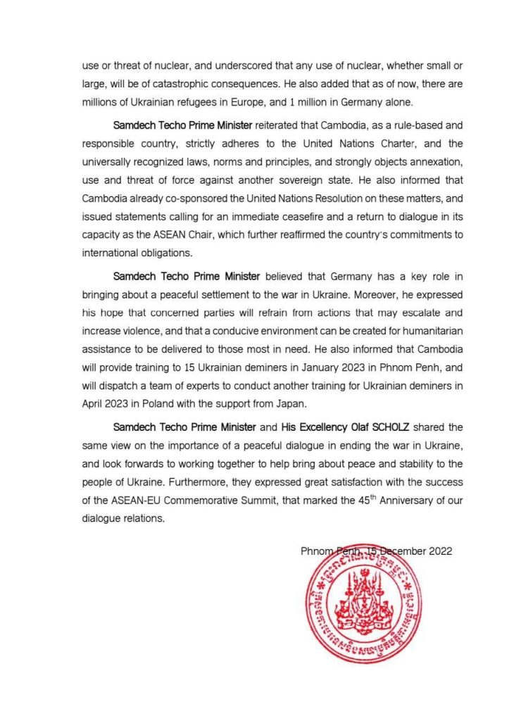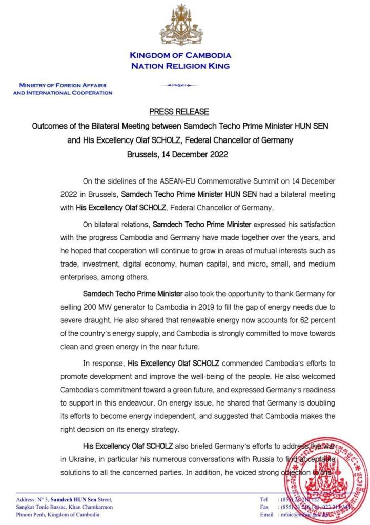 លទ្ធផលនៃជំនួបទ្វេភាគីរវាងសម្តេចតេជោនាយករដ្ឋមន្ត្រី ហ៊ុន សែន និង ឯកឧត្តម អូឡាហ្វ ឆ្លុលស៍ អធិការបតីសហព័ន្ធអាល្លឺម៉ង់ នៅទីក្រុងព្រុចសែល ថ្ងៃទី១៤ ខែធ្នូ ឆ្នាំ២០២២