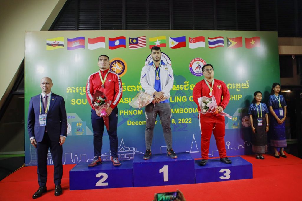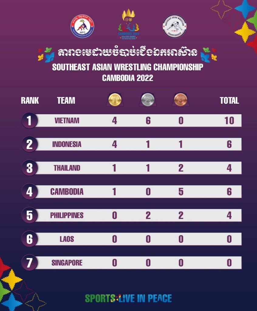 ភ្នំពេញ៖ ការប្រកួតកីឡាចំបាប់ជ្រើសរើសជើងឯកអាស៊ីអាគ្នេយ៍ ឆ្នាំ២០២២ ដែលកម្ពុជាធ្វើជាម្ចាស់ផ្ទះ បានបញ្ចប់លើវិញ្ញាសាក្រិចកូរ៉ូម៉ាំង លើ១០ប្រភេទទម្ងន់ ខណៈម្ចាស់ផ្ទះកម្ពុជាមេដាយដណ្ដើយមេដាយសរុប ៦គ្រឿង មាស១ និងប្រាក់៥ រីឯវៀតណាម និងឥណ្ឌូនេស៊ី ឈរកំពូលតារាងឈ្នះ មេដាយមាស ៤គ្រឿងដូចគ្នា ។