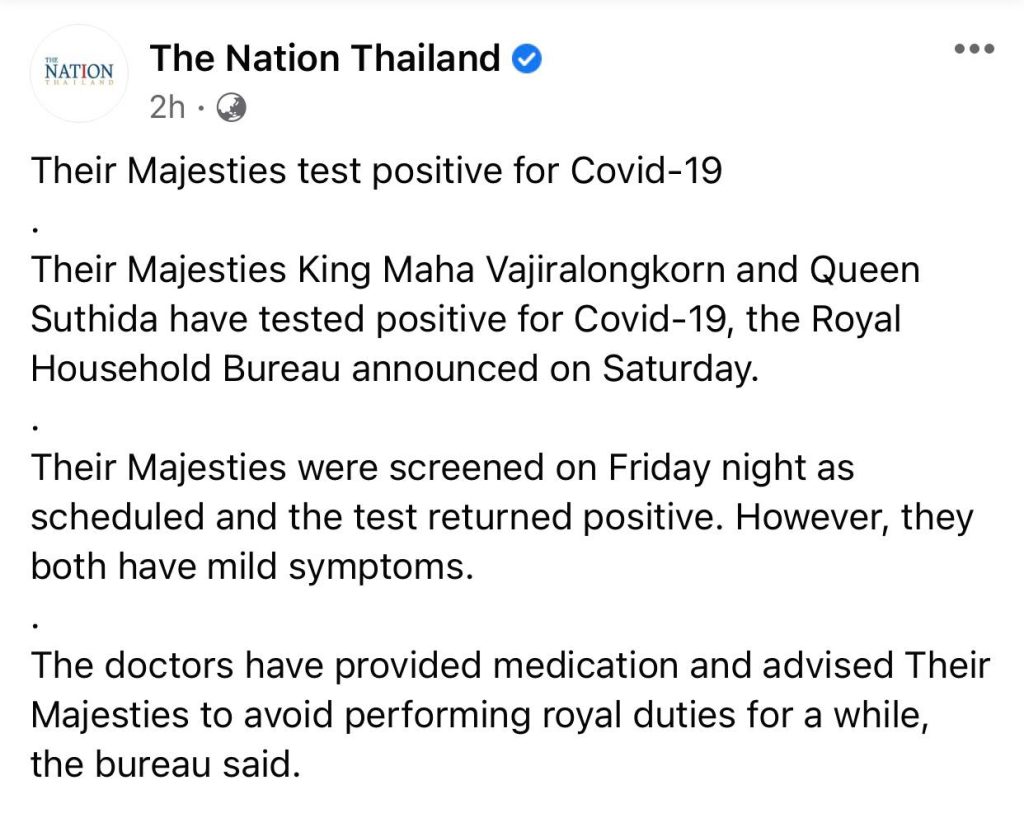 បាងកក៖ ការិយាល័យរាជវង្សបានប្រកាស នាថ្ងៃសៅរ៍នេះថា ព្រះមហាក្សត្រថៃ Maha Vajiralongkorn និងម្ចាស់ក្សត្រី Suthida បានធ្វើតេស្តវិជ្ជមានCovid-19 ។