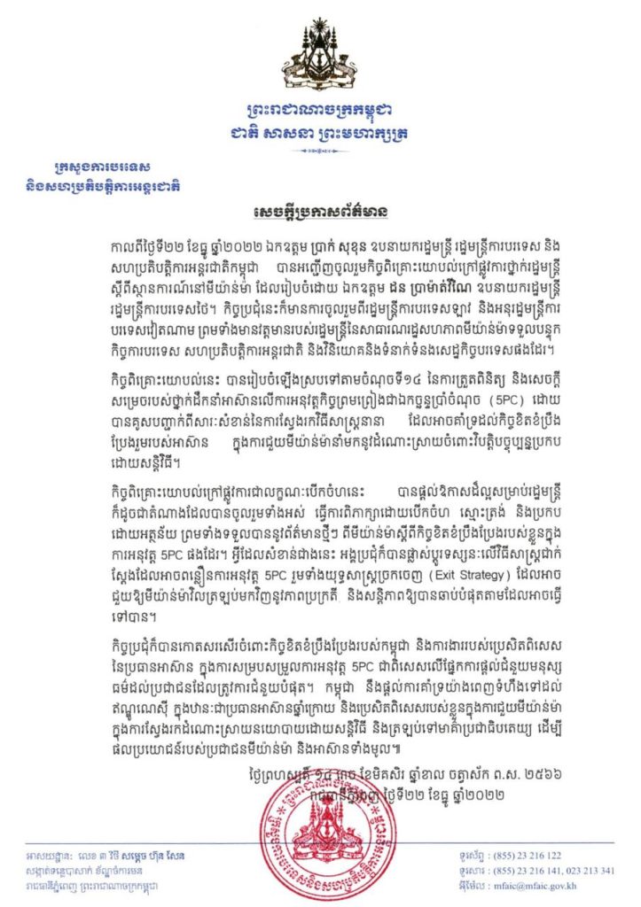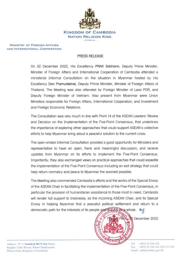 ភ្នំពេញ៖ យោងតាមសេចក្តីប្រកាសព័ត៌មាន ដែលទទួលបាននៅថ្ងៃទី២៣ ខែធ្នូ ឆ្នាំ២០២២ បានឱ្យដឹងថា កាលពីថ្ងៃទី២២ ខែធ្នូ ឆ្នាំ២០២២ ឯកឧត្តម ប្រាក់ សុខុន ឧបនាយករដ្ឋមន្ត្រី រដ្ឋមន្ត្រីការបរទេស និងសហប្រតិបត្តិការអន្តរជាតិកម្ពុជា បានអញ្ជើញចូលរួមកិច្ចពិគ្រោះយោបល់ក្រៅផ្លូវការថ្នាក់រដ្ឋមន្ត្រី ស្តីពីស្ថានការណ៍នៅមីយ៉ាន់ម៉ា ដែលរៀបចំដោយ ឯកឧត្តម ដន ប្រាម៉ាត់វីណៃ ឧបនាយករដ្ឋមន្ត្រី រដ្ឋមន្ត្រីការបរទេសថៃ។ កិច្ចប្រជុំនេះក៏មានការចូលរួមពីរដ្ឋមន្ត្រីការបរទេសឡាវ និងអនុរដ្ឋមន្ត្រីការបរទេសវៀតណាម ព្រមទាំងមានវត្តមានរបស់រដ្ឋមន្ត្រីនៃសាធារណរដ្ឋសហភាពមីយ៉ាន់ម៉ាទទួលបន្ទុក កិច្ចការបរទេស សហប្រតិបត្តិការអន្តរជាតិ វិនិយោគនិងទំនាក់ទំនងសេដ្ឋកិច្ចបរទេសផងដែរ។