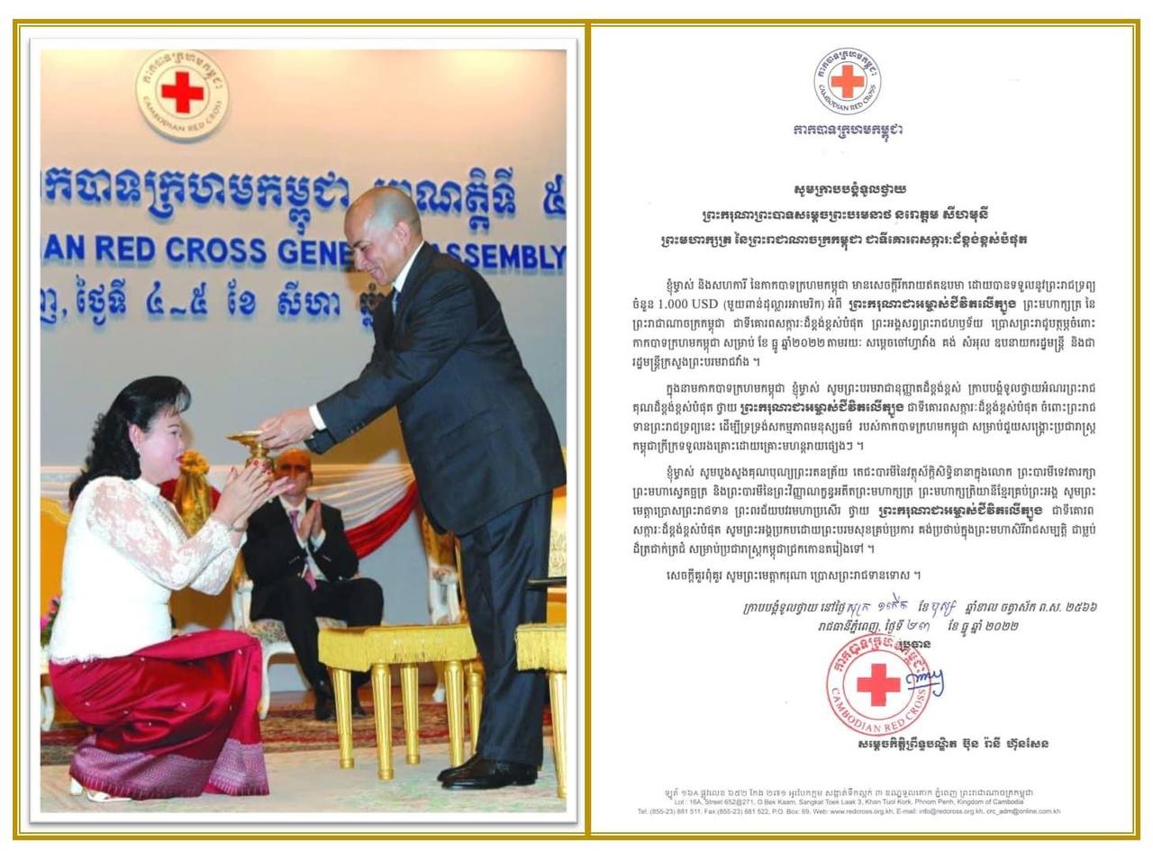 ក្នុងនាមកាកបាទក្រហមកម្ពុជា ខ្ញុំម្ចាស់ សូមព្រះបរមរាជានុញ្ញាតដ៏ខ្ពង់ខ្ពស់ ក្រាបបង្គំទូលថ្វាយអំណរព្រះរាជគុណដ៏ខ្ពង់ខ្ពស់បំផុតថ្វាយ ព្រះករុណាជាអម្ចាស់ជីវិតលើត្បូង ជាទីគោរពសក្ការៈដ៏ខ្ពង់ខ្ពស់បំផុត ចំពោះព្រះរាជទានព្រះរាជទ្រព្យនេះ ដើម្បីទ្រទ្រង់សកម្មភាពមនុស្សធម៌របស់កាកបាទក្រហមកម្ពុជា សម្រាប់ជួយសង្គ្រោះប្រជារាស្រ្តកម្ពុជាក្រីក្រទទួលរងគ្រោះដោយគ្រោះមហន្តរាយផ្សេងៗ។