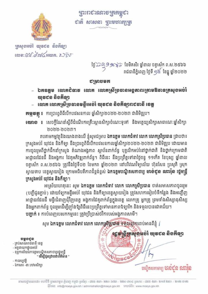 ក្រសួងអប់រំនឹងរៀបចំពិធីបើកបវេសនកាលឆ្នាំសិក្សា ២០២២-២០២៣ ជានិមិត្តរូប ថ្ងៃទី០២ ខែមករាឆ្នាំ២០២៣