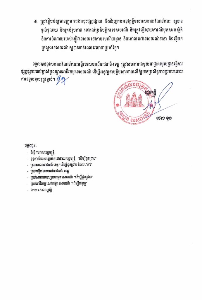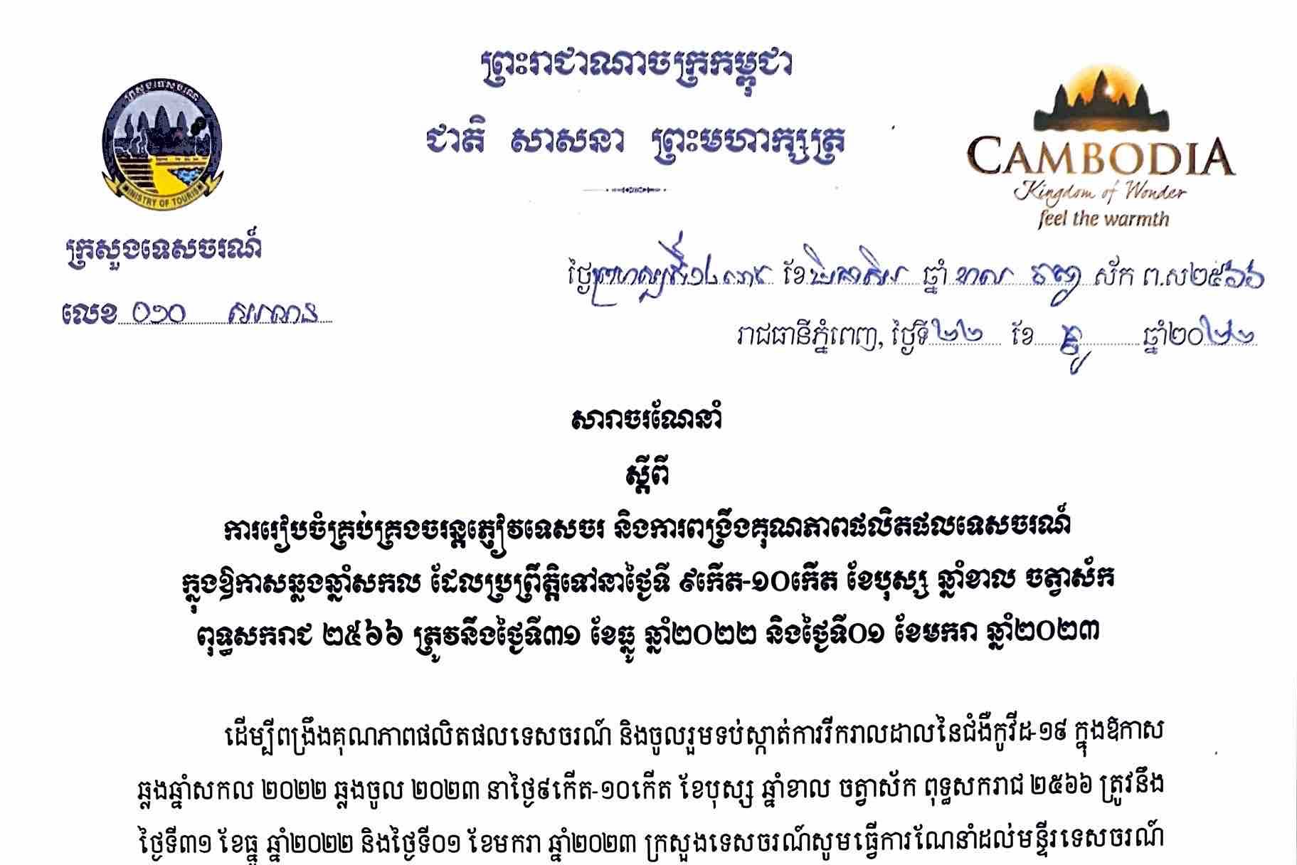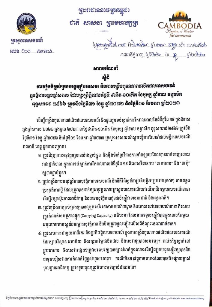 សារាចរណែនាំ ស្តីពី ” ការរៀបចំគ្រប់គ្រងចរន្តភ្ញៀវទេសចរ និងការពង្រឹងគុណភាពផលិតផលទេសចរណ៍ក្នុងឱកាសឆ្លងឆ្នាំសកល “