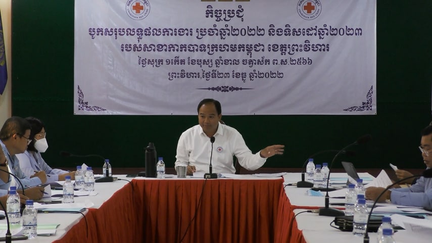 ខេត្តព្រះវិហារ៖ ប្រធានគណៈកម្មាធិការ សាខាកាកបាទក្រហមកម្ពុជា ខេត្តព្រះវិហារ ឯកឧត្តម គីម រិទ្ធី បានដឹកនាំកិច្ចប្រជុំបូកសរុបលទ្ធផលការងារឆ្នាំ២០២២ និងលើកទិសដៅសម្រាប់បន្តអនុវត្តក្នុងឆ្នាំ២០២៣ ដោយមានការចូលរួមពីសមាជិក សមាជិកា គណៈកម្មាធិការសាខា មន្រ្តីសាខា និងអនុសាខាក្រុង-ស្រុកទាំង៨ កាលពីរសៀលថ្ងៃទី២៣ ធ្នូ ២០២២ នៅទីស្នាក់ការ សាខាកាកបាទក្រហមកម្ពុជាខេត្តព្រះវិហារ ។
