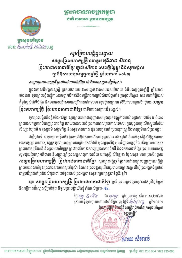 ឯកឧត្តម សាយ សំអាល់ សូមក្រាបបង្គំទូលថ្វាយព្រះពរសម្តេចព្រះមហាក្សត្រី នរោត្តម មុនិនាថ សីហនុ ព្រះវររាជមាតាជាតិខ្មែរ ក្នុងសេរីភាព សេចក្តីថ្លៃថ្នូរ និងសុភមង្គល ក្នុងឱកាសបុណ្យចូលឆ្នាំថ្មី ឆ្នាំសកល២០២៣៖