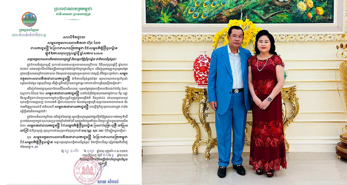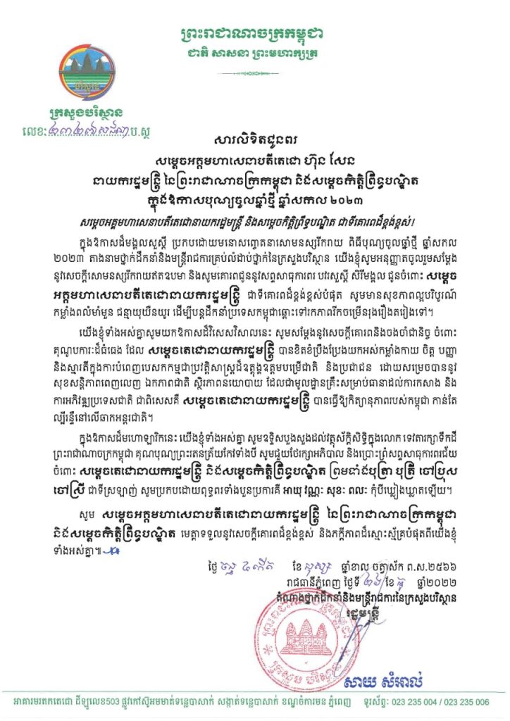 ឯកឧត្តម សាយ សំអាល់ ផ្ញើសារលិខិតជូនពរសម្តេចតេជោ ហ៊ុន សែន នាយករដ្ឋមន្ត្រី នៃព្រះរាជាណាចក្រកម្ពុជា និងសម្តេចកិត្តិព្រឺទ្ធបណ្ឌិត ប៊ុន រ៉ានី ហ៊ុនសែន ក្នុងឱកាសបុណ្យចូលឆ្នាំថ្មី ឆ្នាំសកល២០២៣