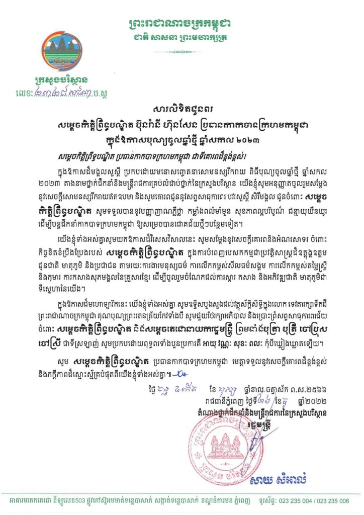 ឯកឧត្តម សាយ សំអាល់ ផ្ញើសារលិខិតជូនពរសម្តេចកិត្តិព្រឹទ្ធបណ្ឌិត ប៊ុន រ៉ានី ហ៊ុនសែន ប្រធានកាកបាទក្រហមកម្ពុជា ក្នុងឱកាសបុណ្យចូលឆ្នាំថ្មី ឆ្នាំសកល២០២៣