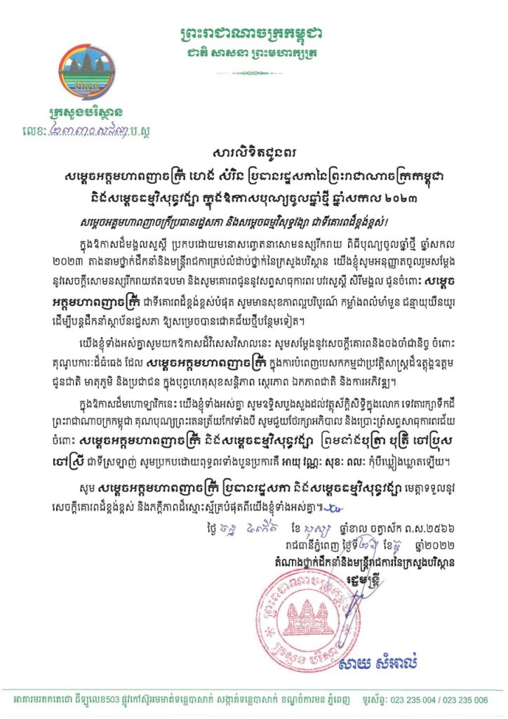 ឯកឧត្តម សាយ សំអាល់ រដ្ឋមន្ត្រីក្រសួងបរិស្ថាន ផ្ញើសារលិខិតជូនពរសម្តេចមហាពញាចក្រី ហេង សំរិន ប្រធានរដ្ឋសភា នៃព្រះរាជាណាចក្រកម្ពុជា និងសម្តេចធម្មវិសុទ្ធវង្សា ក្នុងឱកាសបុណ្យចូលឆ្នាំថ្មី ឆ្នាំសកល២០២៣