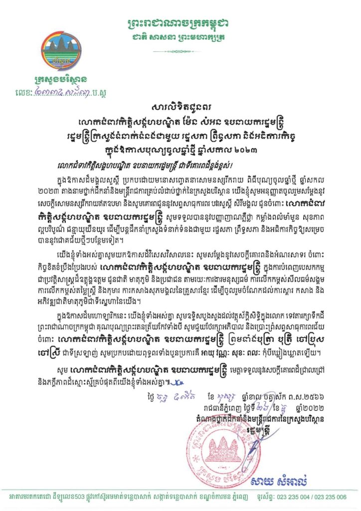 ឯកឧត្តម សាយ សំអាល់ រដ្ឋមន្ត្រីក្រសួងបរិស្ថាន ផ្ញើសារលិខិតជូនពរលោកជំទាវកិត្តិសង្គហបណ្ឌិត ម៉ែន សំអន ឧបនាយករដ្ឋមន្ត្រី រដ្ឋមន្ត្រីក្រសួងទំនាក់ទំនងជាមួយរដ្ឋសភា ព្រឹទ្ធសភា និងអធិការកិច្ច ក្នុងឱកាសបុណ្យចូលឆ្នាំថ្មី ឆ្នាំសកល២០២៣
