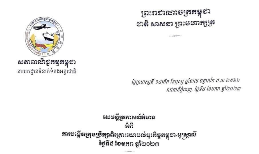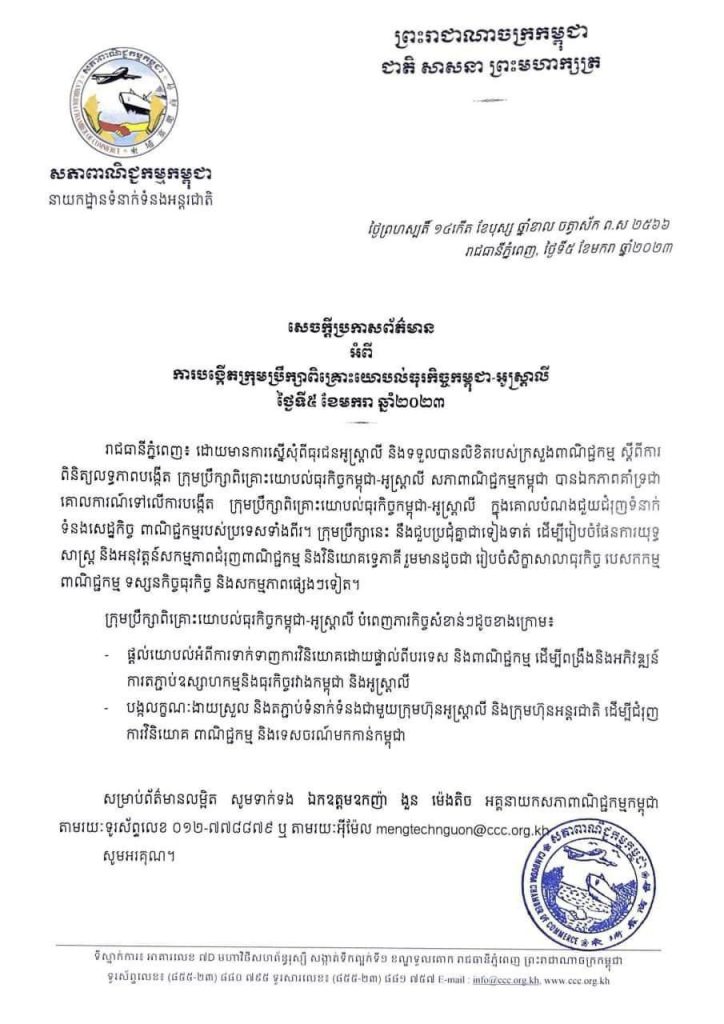 ភ្នំពេញ:ដោយមានការស្នើសុំពីធុរជនអូស្ត្រាលី និងទទួលបានលិខិតរបស់ក្រសួងពាណិជ្ជកម្ម ស្ដីពីការ ពិនិត្យលទ្ធភាពបង្កើត ក្រុមប្រឹក្សាពិគ្រោះយោបល់ធុរកិច្ចកម្ពុជា-អូស្ត្រាលី សភាពាណិជ្ជកម្មកម្ពុជាកាលពីនៅថ្ងៃទី៥ ខែមករា ឆ្នាំ២០២៣ បានឯកភាពគាំទ្រជា គោលការណ៍ទៅលើការបង្កើត ក្រុមប្រឹក្សាពិគ្រោះយោបល់ធុរកិច្ចកម្ពុជា-អូស្ត្រាលី ក្នុងគោលបំណងជួយជំរុញទំនាក់ទំនងសេដ្ឋកិច្ច ពាណិជ្ជកម្មរបស់ប្រទេសទាំងពីរ។