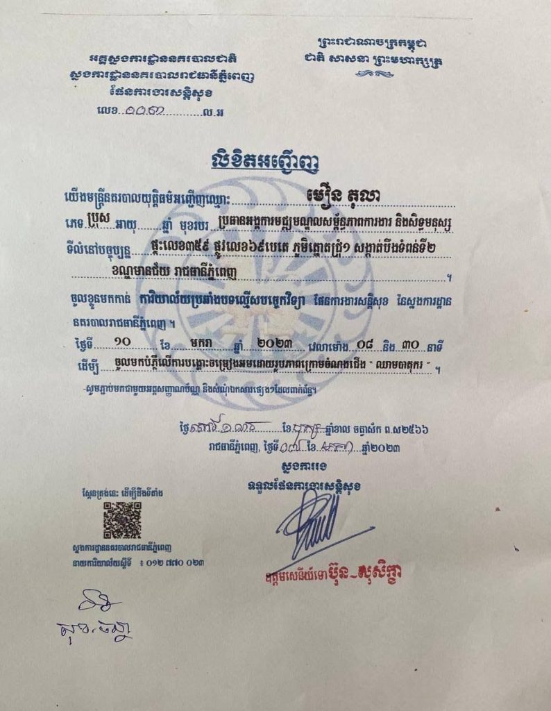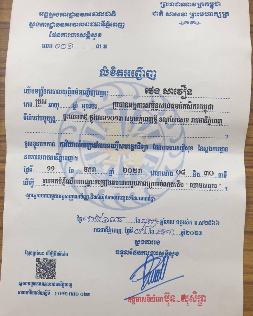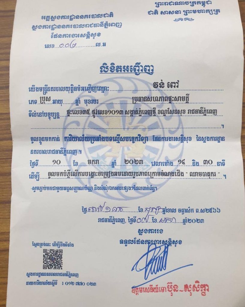 តាមលិខិតអញ្ជើញរបស់ស្នងការរដ្ឋាននគរបាលរាជធានីភ្នំពេញ គឺលោក មឿន តុលា ប្រធានមជ្ឈមណ្ឌលសម្ព័ន្ធភាពការងារ និងសិទ្ធិមនុស្ស ត្រូវចូលបំភ្លឺនៅវេលាម៉ោង៨:៣០នាទីព្រឹក។ លោក វន់ ពៅ ប្រធានសហភាពផ្ទះសាមគ្គីចូលបំភ្លឺថ្ងៃទី១០ ខែមករា ឆ្នាំ២០២៣ វេលាម៉ោង២:៣០នាទីរសៀល។ លោក ថេង សាវឿន ប្រធានសមាគមកសិករ ចូលបំភ្លឺថ្ងៃទី១១ ខែមករា ឆ្នាំ២០២៣ វេលាម៉ោង៨:៣០ព្រឹក ពាក់ព័ន្ធការបង្ហោះចម្រៀងអមដោយរូបភាពក្រោមចំណងជើង «ឈាមបាតុករ»។