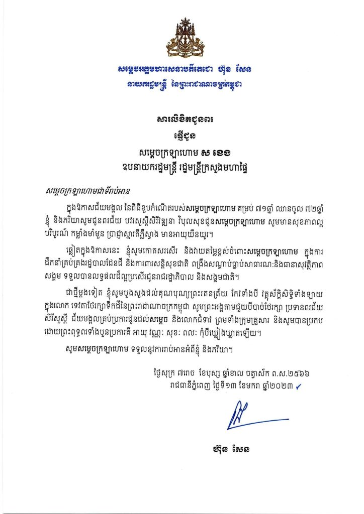 សម្តេចតេជោ ហ៊ុន សែន ផ្ញើសារជូនពរ សម្តេចក្រឡាហោម ស ខេង ក្នុងឱកាសខួបចម្រើនជន្មាយុ ៧១ ឈានចូល ៧២ឆ្នាំ