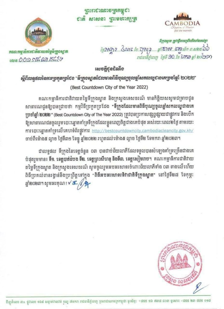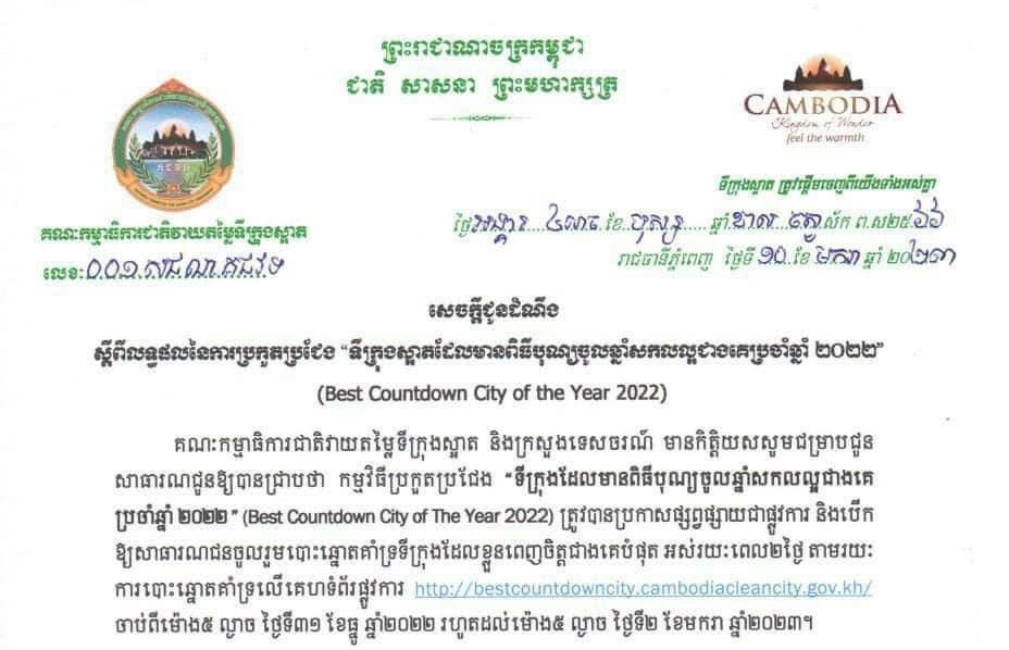 ភ្នំពេញ៖ គណៈកម្មាធិការជាតិវាយតម្លៃទីក្រុងស្អាត និងក្រសួងទេសចរណ៍ បានឱ្យដឹងថា ក្នុងកម្មវិធីប្រកួតប្រជែង “ទីក្រុងដែលមានពិធីបុណ្យចូលឆ្នាំសកលល្អជាងគ ប្រចាំឆ្នាំ ២០២២ ” (Best Countdown City of The Year 2022) ត្រូវបានប្រកាសផ្សព្វផ្សាយជាផ្លូវការ និងបើក ឱ្យសាធារណជនចូលរួមបោះឆ្នោតគាំទ្រទីក្រុងដែលខ្លួនពេញចិត្តជាងគេបំផុត អស់រយៈពេល២ថ្ងៃ តាមរយះ ការបោះឆ្នោតគាំទ្រលើគេហទំព័រផ្លូវការ http://bestcountdowncity.cambodiacleancity.gov.kh/ ចាប់ពីម៉ោង៥ ល្ងាច ថ្ងៃទី៣១ ខែធ្នូ ឆ្នាំ២០២២ រហូតដល់ម៉ោង៥ ល្ងាច ថ្ងៃទី២ ខែមករា ឆ្នាំ២០២៣។