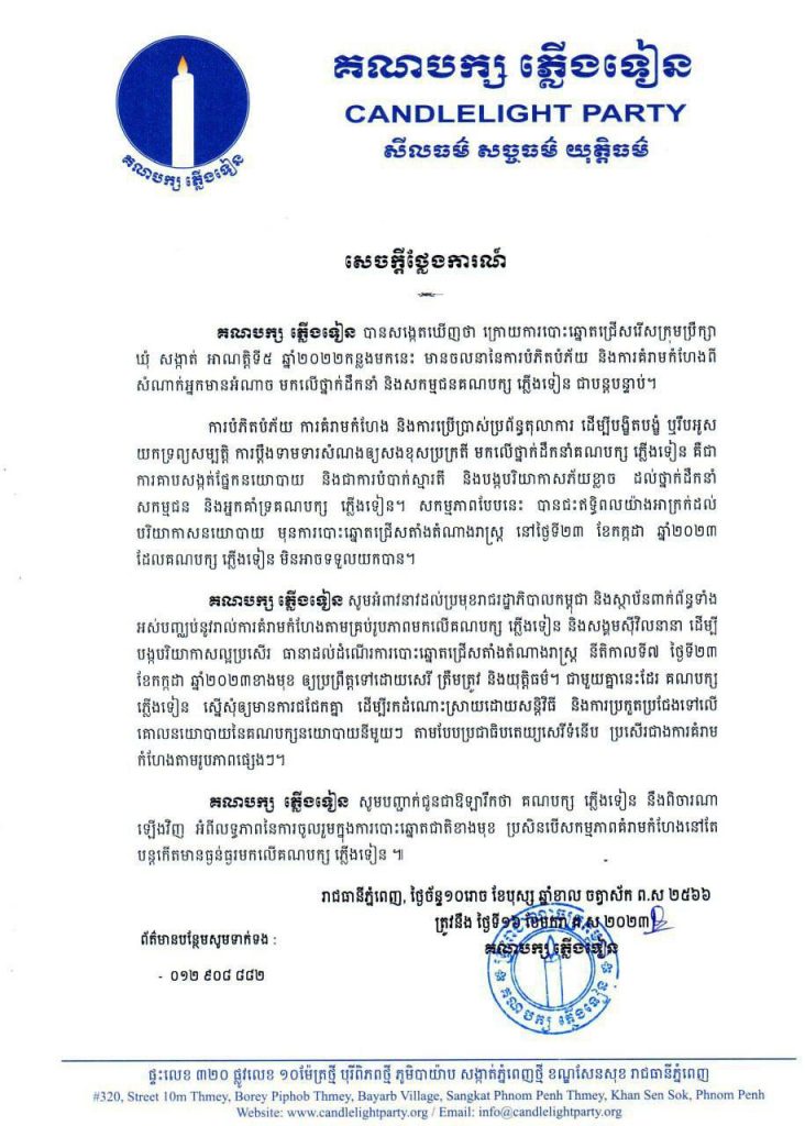 ភ្នំពេញ៖ មន្ត្រីជាន់ខ្ពស់គណៈកម្មាធិការជាតិរៀបចំការបោះឆ្នោត (គ.ជ.ប) បានអះអាងថា ការមិនចូលរួមរបស់គណបក្សនយោបាយណាក៏ដោយ រួមទាំងគណបក្សភ្លើងទៀន ក៏មិនធ្វើឱ្យប៉ះពាល់ដល់ដំណើរការទូទៅនៃការរៀបចំការបោះឆ្នោតជ្រើសតាំងតំណាងរាស្ត្រនោះទេ។ ការអះអាងនះ បានធ្វើឡើងបន្ទាប់ពីគណបក្សភ្លើងទៀន នៅថ្ងៃទី១៦ ខែមករា ឆ្នាំ២០២៣នេះ បានប្រកាសថា គណបក្សភ្លើងទៀន នឹងពិចារណាអំពីលទ្ធភាពនៃការចូលរួមបោះឆ្នោតជាតិខាងមុខ ប្រសិនបើសកម្មភាពគំរាមកំហែងនៅតែបន្តកើតមានលើគណបក្សភ្លើងទៀន។