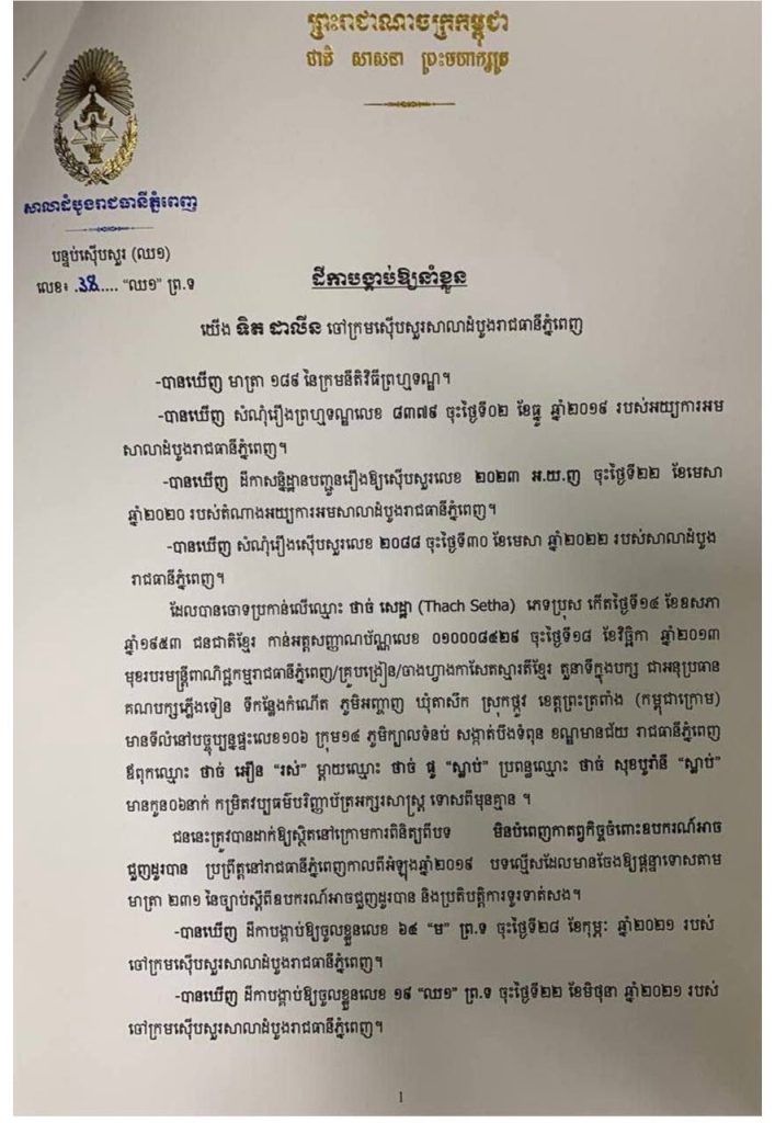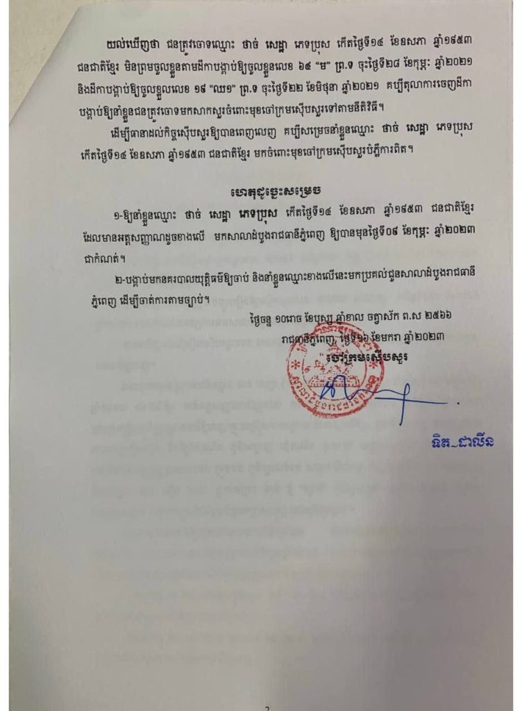 យោងតាមដីកាបង្គាប់ឱ្យនាំខ្លួនបានឱ្យដឹងថា លោកថាច់ សេដ្ឋា ត្រូវបានដាក់ឱ្យស្ថិតនៅក្រោមការពិនិត្យពីបទ មិនបំពេញកាតព្វកិច្ចចំពោះឧបករណ៍អាចជួញដូរបានប្រព្រឹត្តនៅរាជធានីភ្នំពេញកាលពីអំឡុងឆ្នាំ២០១៩ បទល្មើសដែលមានចែងឱ្យផ្ដន្ទាទោសតាម មាត្រា ២៣១ នៃច្បាប់ស្តីពីឧបករណ៍អាចជួញដូរបាន និងប្រតិបត្តិការទូរទាត់សង។ យល់ឃើញថា ជនត្រូវចោទឈ្មោះ ថាច់ សេដ្ឋា មិនព្រមចូលខ្លួនតាមដីកាបង្គាប់ឱ្យចូលខ្លួនលេខ ៦៤ “ម” ព្រ.ទ ចុះថ្ងៃទី២៨ ខែកុម្ភៈ ឆ្នាំ២០២១ និងដីកាបង្គាប់ឱ្យចូលខ្លួលលេខ ១៩ “ឈ១” ព្រទ ចុះថ្ងៃទី២២ ខែមិថុនា ឆ្នាំ២០២១ គប្បីតុលាការចេញដីកា បង្គាប់ឱ្យនាំខ្លួនជនត្រូវចោទមកសាកសួរចំពោះមុខចៅក្រមស៊ើបសួរទៅតាមនីតិវិធី។ ដើម្បីធានាដល់កិច្ចស៊ើបសួរឱ្យបានពេញលេញ គប្បីសម្រេចនាំខ្លួនឈ្មោះ ថាច់ សេដ្ឋា កចំពោះមុខចៅក្រមស៊ើបសួរបំភ្លឺការពិត។ ហេតុដូច្នេះសម្រេចឱ្យនាំខ្លួនឈ្មោះ ថាច់ សេដ្ឋា មកសាលាដំបូងរាជធានីភ្នំពេញ ឱ្យបានមុនថ្ងៃទី០៩ ខែកុម្ភៈ ឆ្នាំ២០២៣ ជាកំណត់។ បង្គាប់មកនគរបាលយុត្តិធម៌ឱ្យចាប់ និងនាំខ្លួនឈ្មោះខាងលើនេះមកប្រគល់ជូនសាលាដំបូងរាជធានី ភ្នំពេញ ដើម្បីចាត់ការតាមច្បាប់៕ ដោយ៖ពលជ័យ