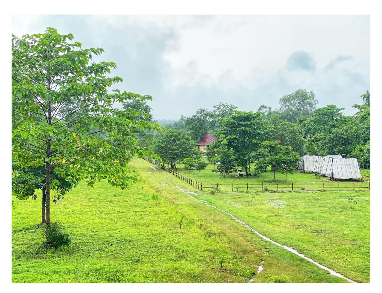 ស្មៅខៀវស្រងាត់ដែលដុះព័ទ្ធជុំវិញ ជាញឹកញយត្រូវបានអ្នកមើល ថែ កាត់តម្រឹមយ៉ាងមានរបៀបរៀបរយ។ ផ្ទះឈើប្រភេទផ្សេងៗគ្នា ត្រូវបានសាងសង់ដាច់ដោយឡែកពីគ្នា ដើម្បីទទួលភ្ញៀវទៅតាម ចំណូលចិត្តរបស់អ្នកស្នាក់នៅ។ រីឯនៅមួយជ្រុងទៀតនៃចម្ការក៏មានចិញ្ចឹមសត្វចៀមពីរបីក្បាលផងដែរ។ឯជ្រុងទៀត មានក្បូនប្ញស្សីបណ្ដែតលើទឹកព្រែកទុក សម្រាប់ ភ្ញៀវជិះលេងកម្សាន្ដ អមទៅដោយដើមឈើខ្ពស់ៗចោល ម្លប់ ត្រឈៃ ទៅដល់ភ្ញៀវប្រុសស្រីដែលអង្គុយយោលជើងលើទឹក និងជជែកគ្នាសើចក្អាកក្អាយ។