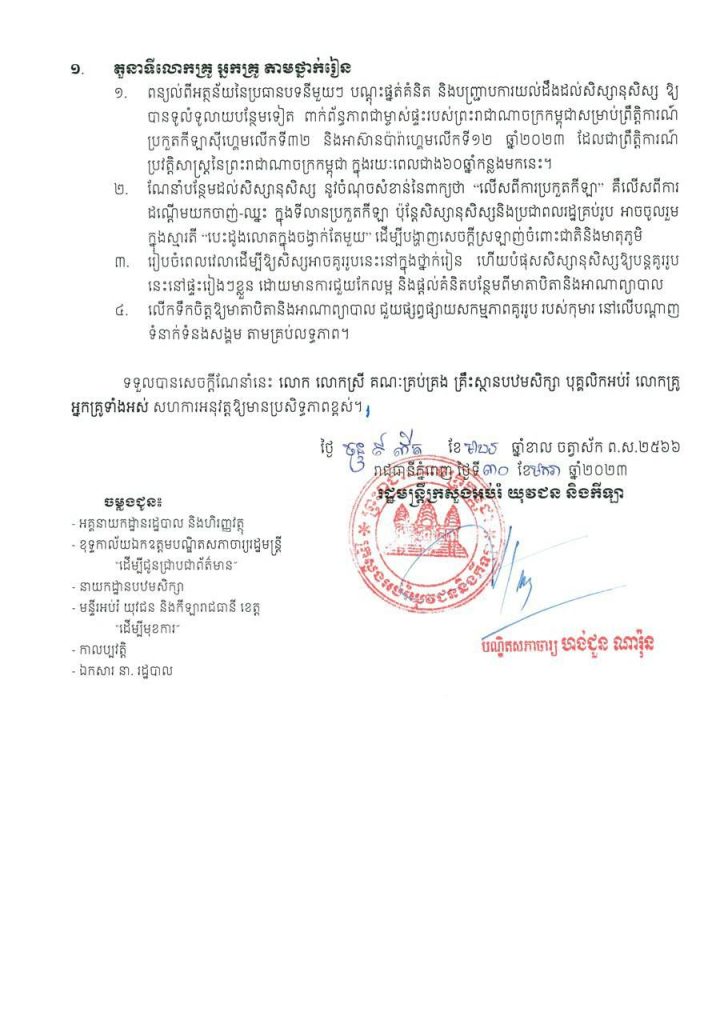 នៅក្នុងសេចក្ដីណែនាំបន្ថែម របស់ក្រសួងអប់រំ ដែលបានចេញសេចក្តីណែនាំនៅថ្ងៃទី៣១ ខែមករា ឆ្នាំ២០២៣នេះ មានខ្លឹមសារដូចនេះថា៖