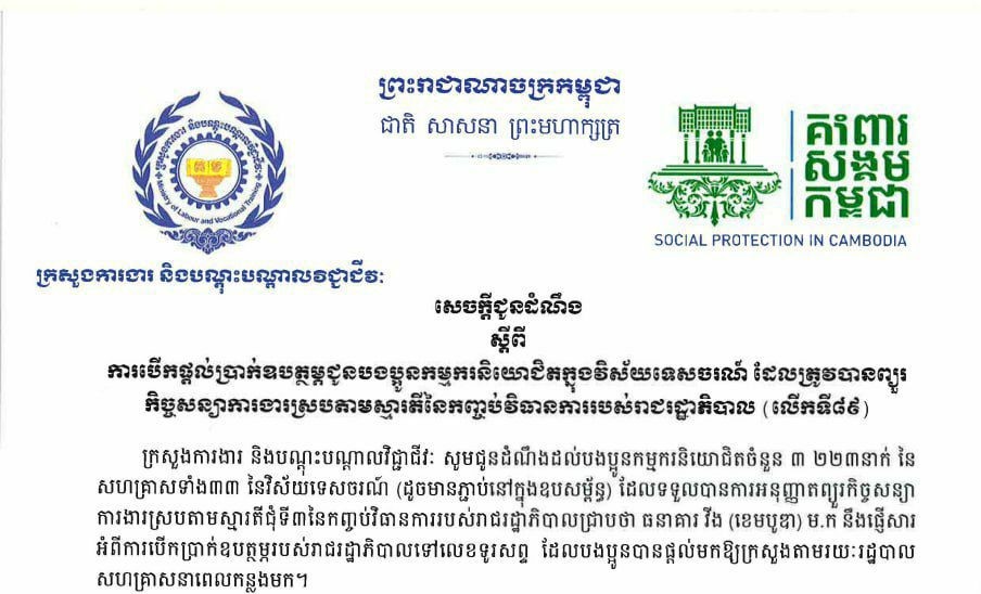 ភ្នំពេញ៖ ក្រសួងការងារ និងបណ្តុះបណ្តាលវិជ្ជាជីវៈបានចេញសេចក្តីជូនដំណឹងមួយស្តីពីការបើកផ្ដល់ប្រាក់ឧបត្ថម្ភជូនបងប្អូនកម្មករនិយោជិតក្នុងវិស័យទេសចរណ៍ ដែលត្រូវបានព្យួរ កិច្ចសន្យាការងារសបតាមស្មារតីនៃកញ្ចប់វិធានការរបស់រាជរដ្ឋាភិបាលលើកទី៨៩។