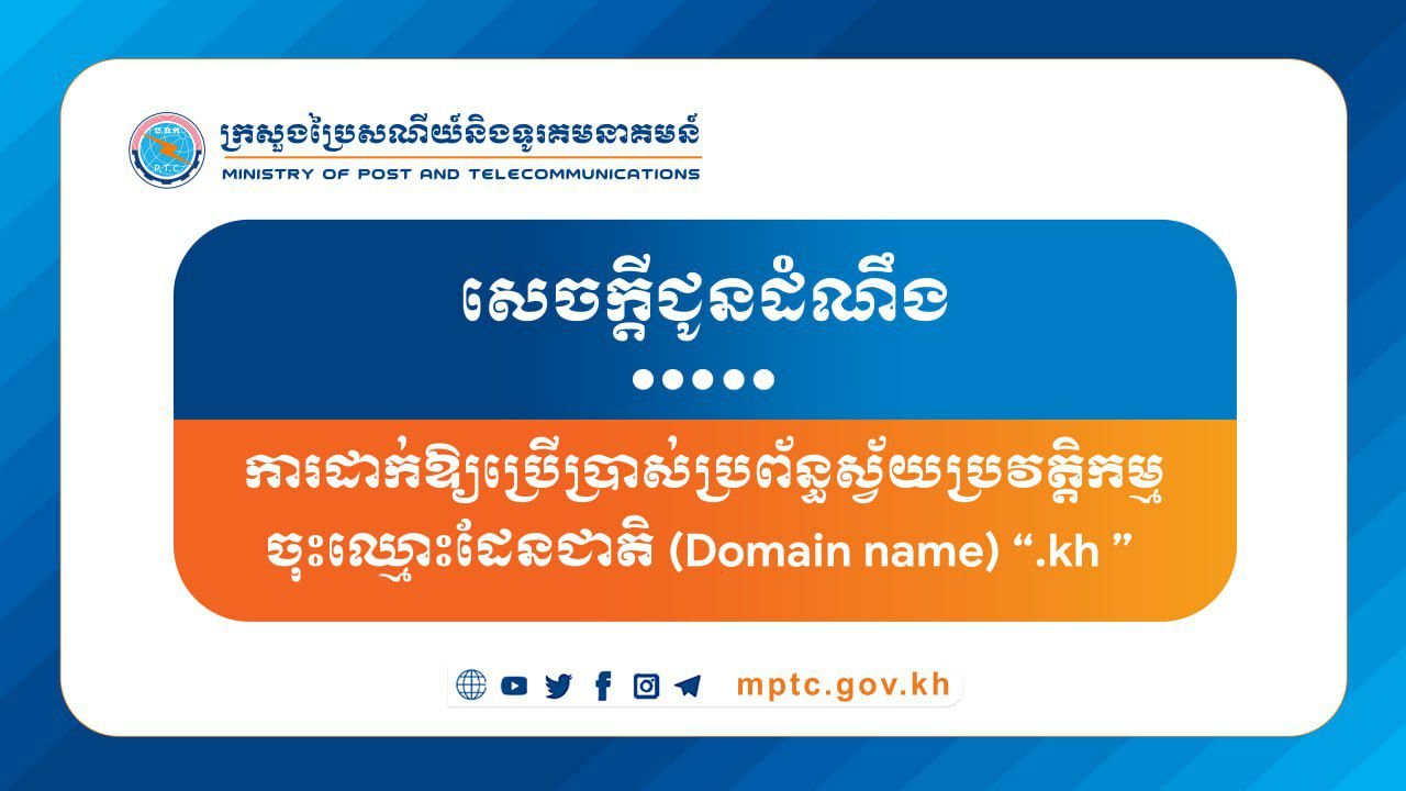 ភ្នំពេញ៖ ក្រសួងប្រៃសណីយ៍និងទូរគមនាគមន៍ (ក.ប.ទ.) បានចេញសេចក្តីជូនដំណឹងមួយនៅថ្ងៃទី ៣១ ខែ មករាឆ្នាំ ២០២៣ដល់សាធារណជនពីការដាក់ឱ្យប្រើប្រាស់នូវប្រព័ន្ធស្វ័យប្រវត្តិកម្មចុះឈ្មោះដែនជាតិ (Domain name) “.kh ” ។