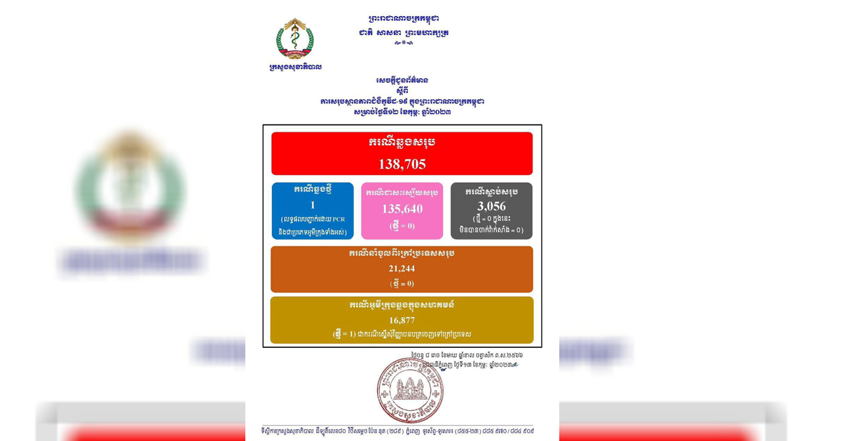 ករណីជំងឺកូវីដ-១៩នៅថ្ងៃនេះ ៖ អ្នកឆ្លងថ្មី ០១នាក់, គ្មានអ្នក ជាសះស្បើយ និងគ្មាន អ្នកជំងឺស្លាប់