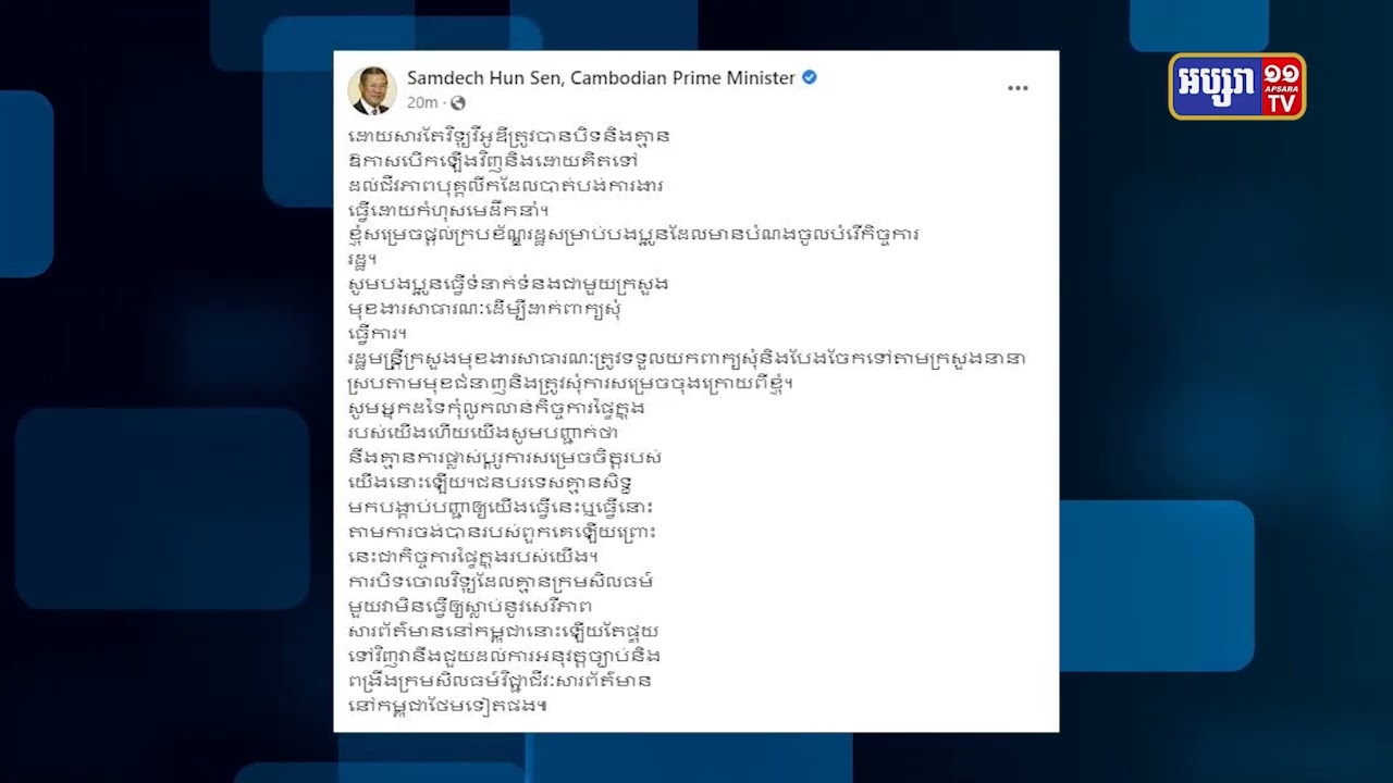 សម្តេចតេជោ ហ៊ុន សែន បានថ្លែងក្នុងបណ្តាញសង្គមជាផ្លូវការបញ្ជាក់នៅថ្ងៃទី១៤កុម្ភៈនេះថា «ដោយសារតែវិទ្យុវីអូឌីត្រូវបានបិទ និងគ្មានឱកាសបើកឡើងវិញ និងដោយគិតទៅដល់ជីវភាពបុគ្គលិកដែលបាត់បង់ការងារធ្វើដោយសារកំហុសមេដឹកនាំ, ខ្ញុំសម្រេចផ្តល់ក្របខណ្ឌរដ្ឋសម្រាប់បងប្អូនដែលមានបំណងចូលបំរើកិច្ចការរដ្ឋ»។
