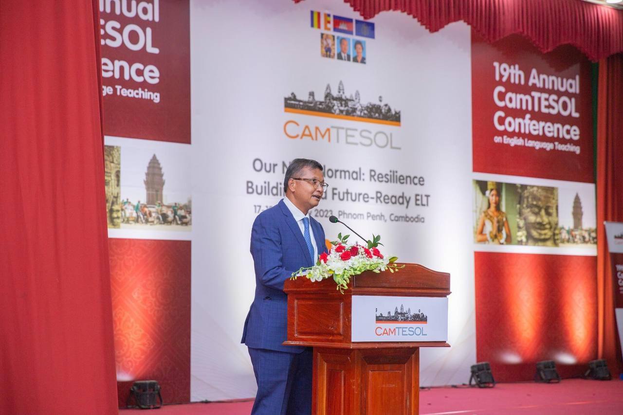 ភ្នំពេញ៖ ឯកឧត្ដមបណ្ឌិតសភាចារ្យ ហង់ជួន ណារ៉ុន រដ្ឋមន្ត្រីក្រសួងអប់រំ យុវជន និងកីឡា បានអញ្ជើញប្រកាសបើកជាផ្លូវការសន្និសីទ CamTESOL ប្រចាំឆ្នាំលើកទី១៩ ក្រោមប្រធានបទ “Our Next Normal: Resilience Building and Future-Ready ELT” ដែលមានប្រតិភូជាតិ និងអន្តរជាតិជាង ១ ៥០០ នាក់ មកពីជុំវិញពិភពលោក ពិធីនេះបានរៀបចំឡើងនៅវិទ្យាស្ថានបច្ចេកវិទ្យាកម្ពុជា (ITC) រាជធានីភ្នំពេញ។
