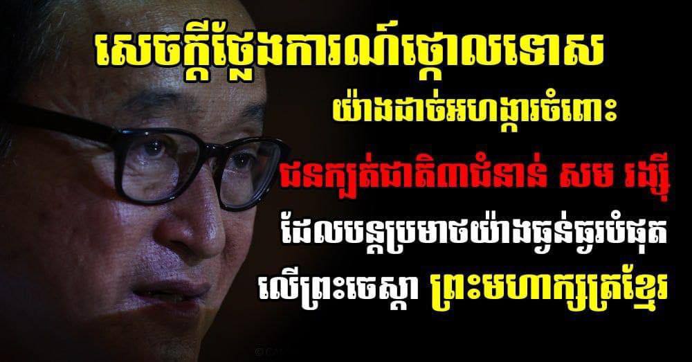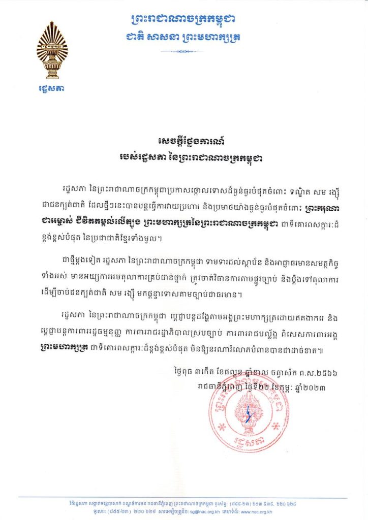 ភ្នំពែញ៖ រដ្ឋសភា នៃព្រះរាជាណាចក្រកម្ពុជាបានថ្កោលទោសដ៏ធ្ងន់ធ្ងរបំផុតចំពោះ ទណ្ឌិត សម រង្ស៊ី ជាជនក្បត់ជាតិ ដែលថ្មីៗនេះបានបន្តធ្វើការវាយប្រហារ និងប្រមាថយ៉ាងធ្ងន់ធ្ងរបំផុតចំពោះ ព្រះករុណា ជាអម្ចាស់ជីវិតតម្កល់លើត្បូង ព្រះមហាក្សត្រនៃព្រះរាជាណាចក្រកម្ពុជា ជាទីគោរពសក្ការៈដ៏ខ្ពង់ខ្ពស់បំផុត នៃប្រជាជាតិខ្មែរទាំងមូល។ នេះបើយោងតាមសេចក្តីថ្លែងការណ៍របស់រដ្ឋសភានៅថ្ងៃទី២២ ខែកុម្ភៈ ឆ្នាំ២០២៣។