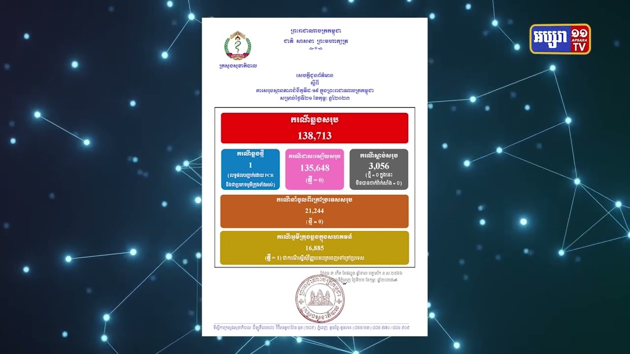 ២៤ម៉ោងចុងក្រោយកម្ពុជាមានតួលេខឆ្លងកូវីដ១៩ មានចំនួន ១ករណី (Video Inside)