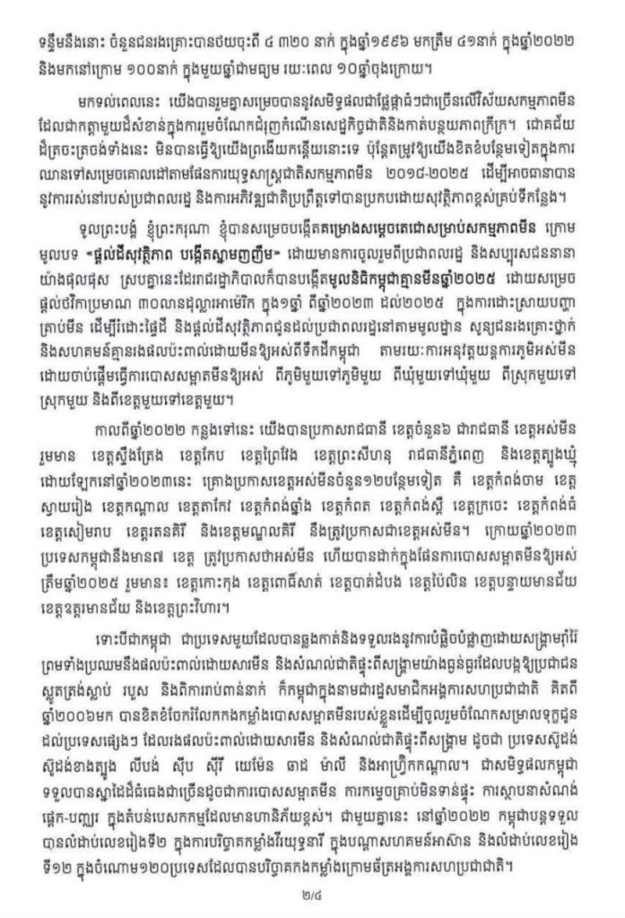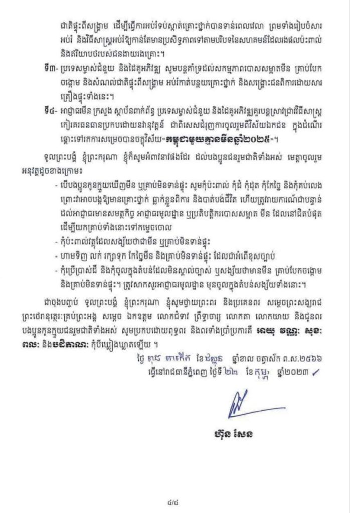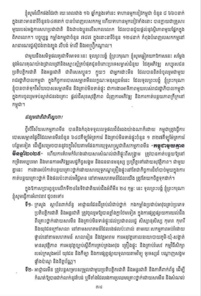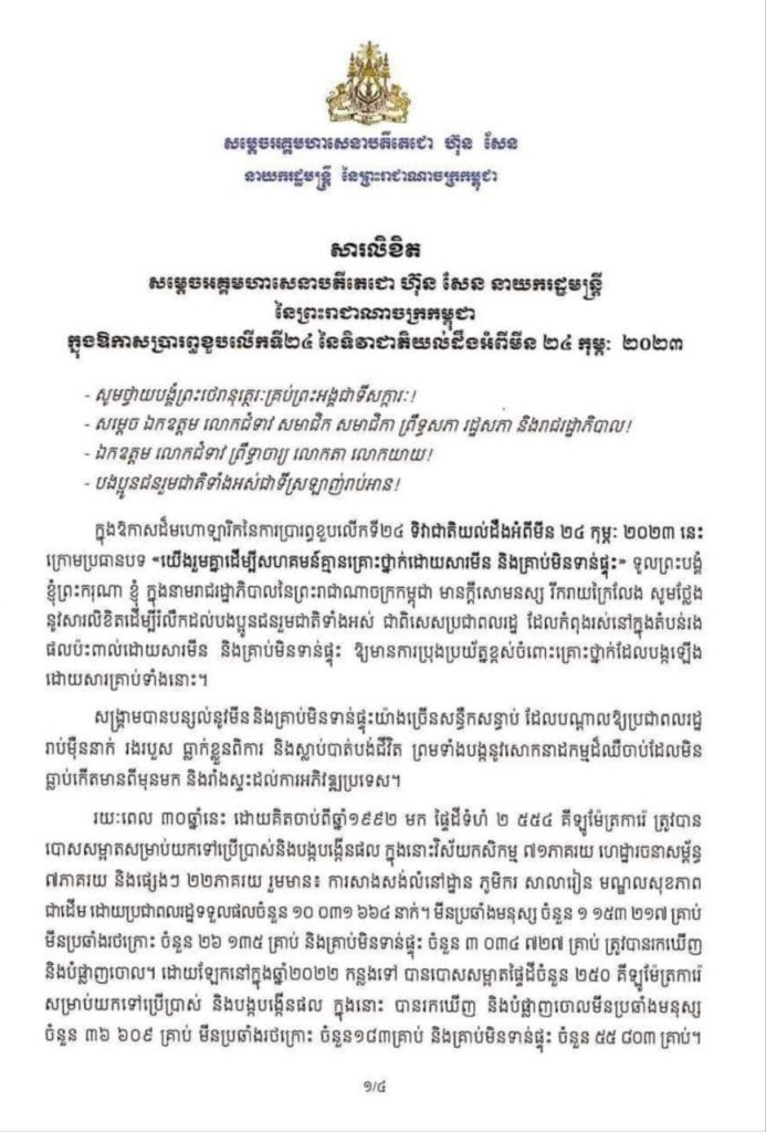 ខាងក្រោមនេះ គឺ សារលិខិត សម្ដេចអគ្គមហាសេនាបតីតេជោ ហ៊ុន សែន នាយករដ្ឋមន្ត្រី នៃព្រះរាជាណាចក្រកម្ពុជា ក្នុងឱកាសប្រារព្ធខួបលើកទី២៤ ទិវាជាតិយល់ដឹងអំពីមីន ២៤ កុម្ភៈ ២០២៣៕