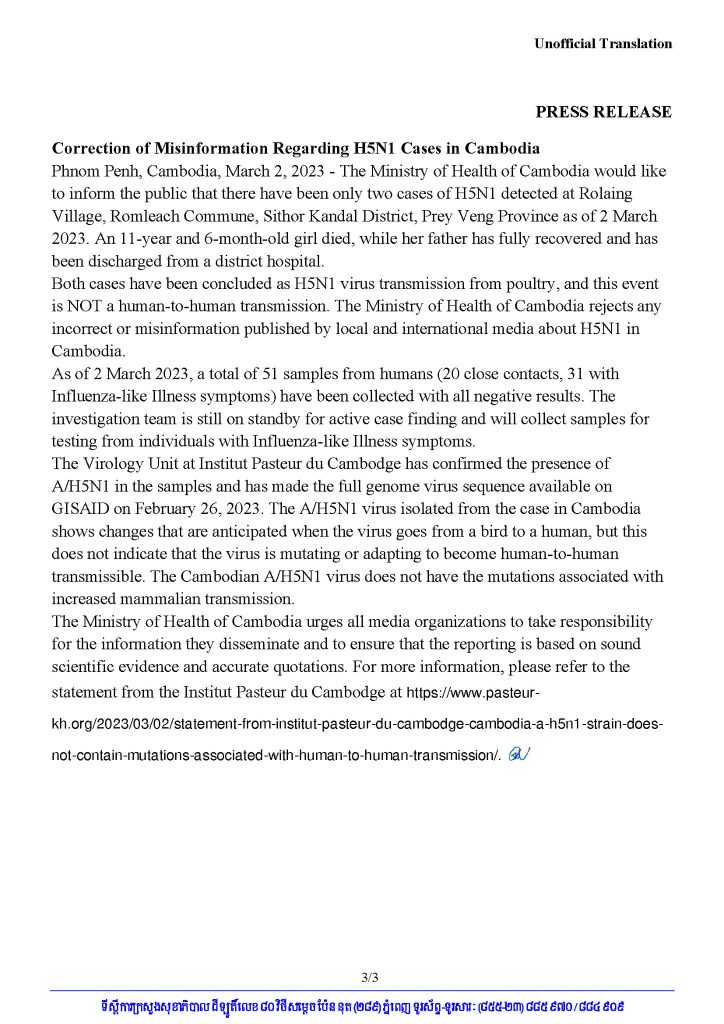ជាមួយគ្នានេះដែរ ក្រសួងសុខាភិបាលកម្ពុជា សូមច្រានចោលទាំងស្រុង នូវរាល់ព័ត៌មានមិនត្រឹមត្រូវ ឬ ព័ត៌មានមិនពិត ដែលត្រូវបានផ្សព្វផ្សាយ ដោយប្រព័ន្ធផ្សព្វផ្សាយទាំងនៅក្នុងប្រទេស និងក្រៅប្រទេស ស្តីអំពីករណី ជំងឺ គ្រុនផ្តាសាយបក្សី H5N1 នៅកម្ពុជានេះ។