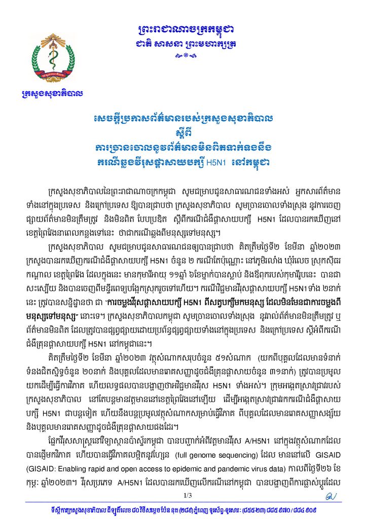 សេចក្តីប្រកាសព័ត៌មានរបស់ក្រសួងសុខាភិបាល បានឱ្យដឹងថា គិតត្រឹម ថ្ងៃទី២ ខែមីនា ឆ្នាំ២០២៣ ក្រសួងបានរកឃើញករណីជំងឺផ្តាសាយបក្សី H5N1 ចំនួនពីរករណីតែប៉ុណ្ណោះ នៅភូមិរលាំង ឃុំរំលេច ស្រុកស៊ីធរ កណ្តាល ខេត្តព្រៃវែង ដែលក្នុងនេះ មានកុមារីអាយុ ១១ឆ្នាំ ៦ខែម្នាក់ បានស្លាប់ និងឪពុករបស់កុមារីរូបនេះ បានជាសះស្បើយ និងបានចេញ ពីមន្ទីរពេទ្យបង្អែកស្រុករួចទៅហើយ។