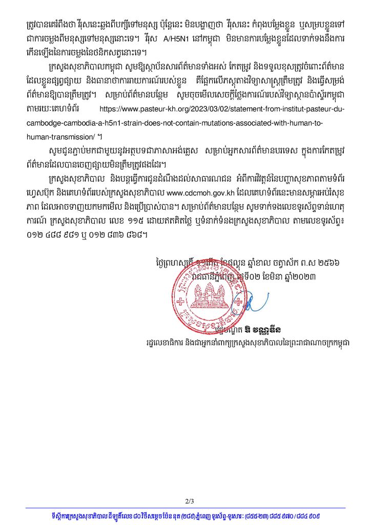 ក្រសួងបន្តទៀតថា ផ្នែកវីរុសសាស្ត្រនៅវិទ្យាស្ថានប៉ាស្ទ័រកម្ពុជា បានបញ្ជាក់ អំពី វត្តមានវីរុស A/H5N1 នៅក្នុងវត្ថុសំណាកដែលបានផ្ញើមកវិភាគ ហើយ បានធ្វើវិភាគលម្អិតនូវហ្សែន (full genome sequencing) ដែលមាននៅ លើ GISAID កាលពីថ្ងៃទី២៦ ខែកុម្ភៈ ឆ្នាំ២០២៣។ វីរុសប្រភេទ A/H5N1 ដែលបានរកឃើញលើករណីនៅកម្ពុជា បានបង្ហាញពីការផ្លាស់ប្តូរដែល ត្រូវបាន គេរំពឹងថា វីរុសនេះឆ្លងពីបក្សីទៅមនុស្ស ប៉ុន្តែមិន បង្ហាញ ថា វីរុសនេះ កំពុងបម្លែងខ្លួន ឬសម្របខ្លួនទៅ ជាការចម្លងពីមនុស្សទៅមនុស្សនោះទេ។ វីរុស A/H5N1 នៅកម្ពុជា មិនមានការបម្លែងខ្លួនដែលទាក់ទងនឹងការ កើន ឡើងនៃការចម្លងនៃថនិកសត្វនោះទេ។