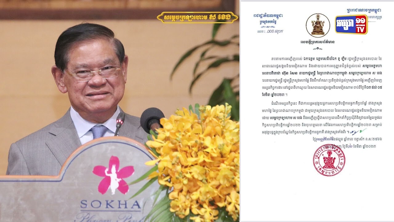 ឧបនាយករដ្ឋមន្ត្រី និងជារដ្ឋមន្ត្រីក្រសួងមហាផ្ទៃសម្តេចក្រឡាហោម ស ខេង កំពុងបំពេញទស្សនកិច្ច៣ថ្ងៃ ក្នុងប្រទេសវៀតណាម ដែលនឹងធ្វើការចុះហត្ថលេខាលើផែនការសហប្រតិបត្តិការឆ្នាំ២០២៣រវាងប្រទេសទាំងពីរ។