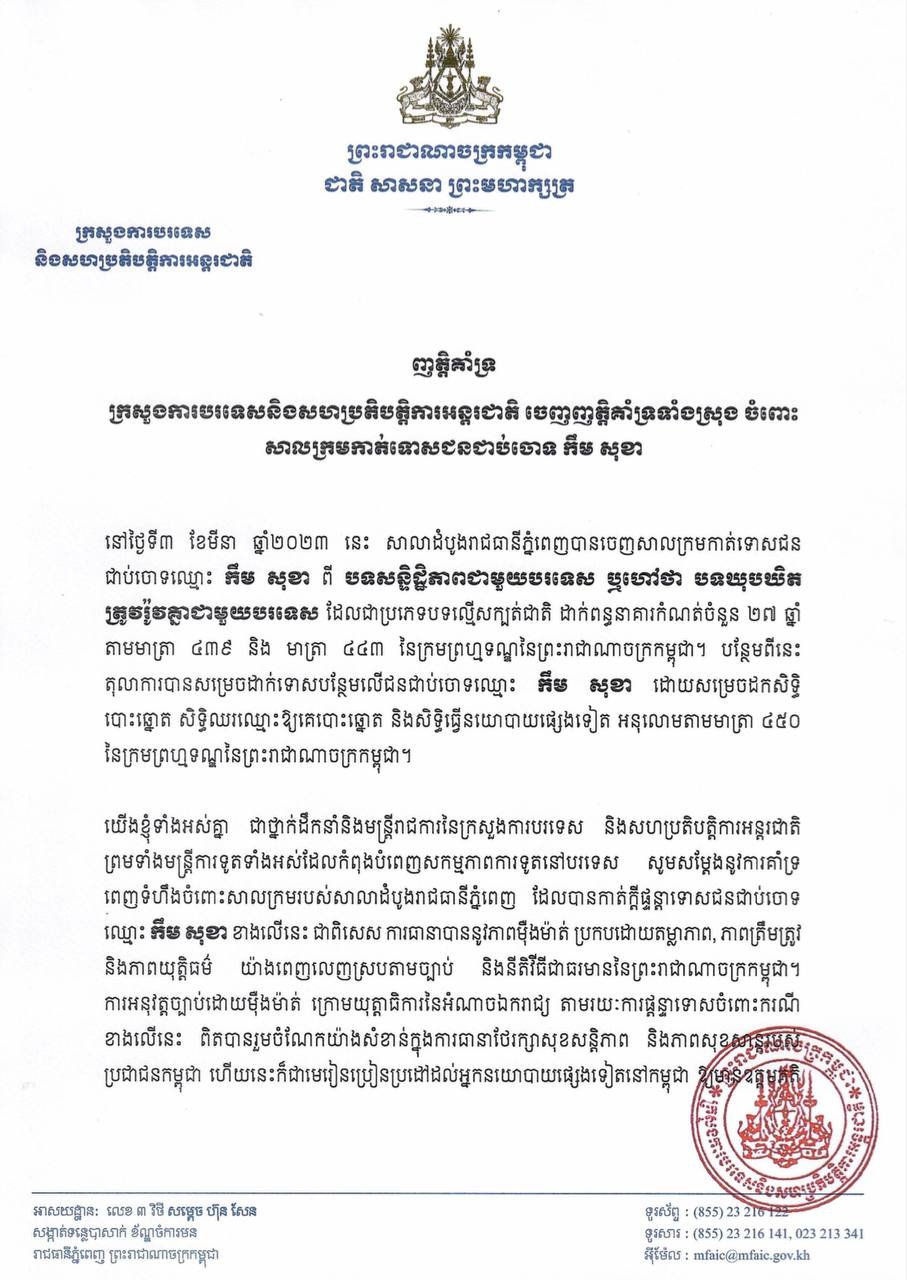ក្រសួងការបរទេស និងសហប្រតិបត្តិការអន្តរជាតិ គាំទ្រទាំងស្រុងចំពោះសាលក្រមកាត់ទោសជនជាប់ចោទ កឹម សុខា