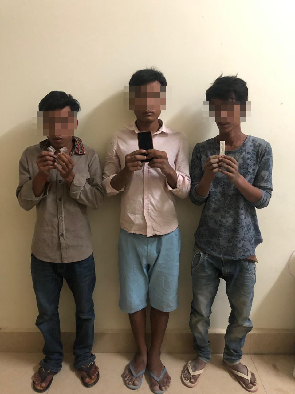 ជនសង្ស័យទី១)ឈ្មោះ ខែក សាមឿន ភេទប្រុស អាយុ២២ឆ្នាំ ២)ឈ្មោះ នង និមល ភេទប្រុស អាយុ២៩ឆ្នាំ និង៣)ឈ្មោះ ពៅ អិន ភេទប្រុស អាយុ១៩ឆ្នាំ (អ្នកទាំង៣ មុខរបរកម្មករសំណង់ ស្នាក់ក្នុងការដ្ឋានសំណង់ សង្កាត់ទឹកថ្លា ខណ្ឌសែនសុខ)។ សមត្ថកិច្ចដកហូតបាន៖ ក្រាមសថ្លា០២កូនថង់តូច និងទូរសព្ទដៃ០១គ្រឿងផងដែរ។