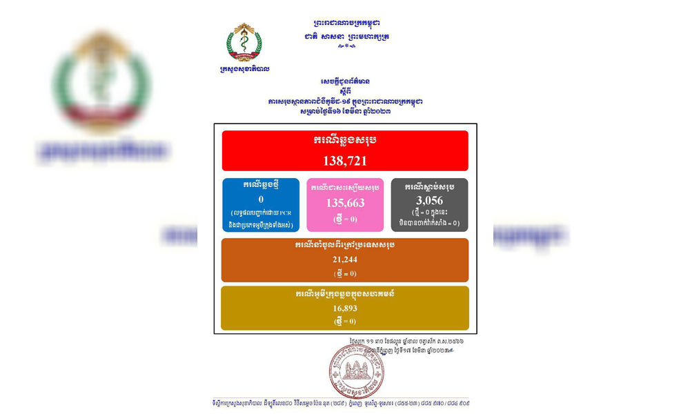 គួរបញ្ជាក់ថា នៅក្នុង សេចក្ដីជូនដំណឹងរបស់ក្រសួងសុខាភិបាល នៅថ្ងៃទី១៦ ខែមីនា ឆ្នាំ ២០២៣ គ្មានអ្នកឆ្លង ថ្មី , គ្មានអ្នកជាសះស្បើយ និងអ្នកជំងឺស្លាប់ គ្មាន ៖