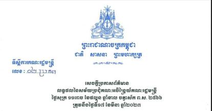 ភ្នំពេញ៖ នារសៀលថ្ងៃសុក្រ ទី១៧ ខែមីនា ឆ្នាំ២០២៣ វេលាម៉ោង១៥ នៅវិមានសន្ដិភាព ទីស្តីការគណៈរដ្ឋមន្ត្រី មានបើកសម័យប្រជុំគណៈអចិន្ត្រៃយ៍គណៈរដ្ឋមន្ត្រី ក្រោម អធិបតីភាពដ៏ខ្ពង់ខ្ពស់បំផុតរបស់ សម្តេចអគ្គមហាសេនាបតីតេជោ ហ៊ុន សែន នាយករដ្ឋមន្ត្រីនៃព្រះរាជាណាចក្រកម្ពុជា ដើម្បីពិនិត្យនិងពិភាក្សាលើសេចក្ដីព្រាងច្បាប់ស្ដីពីការអនុម័តយល់ព្រមលើសន្ធិសញ្ញាកំណត់ ព្រំដែនរដ្ឋរវាង ព្រះរាជាណាចក្រកម្ពុជា និងសាធារណរដ្ឋប្រជាធិបតេយ្យប្រជាមានិតឡាវ។