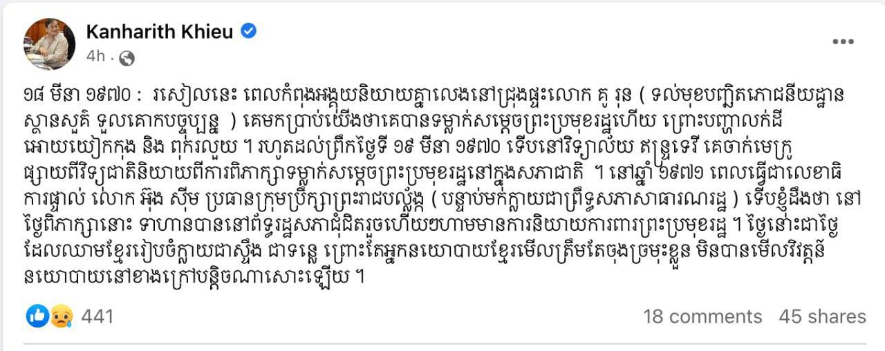 ថ្ងៃទី១៨ មីនា ១៩៧០ ជាថ្ងៃដែលឈាមខ្មែររៀបចំក្លាយជាស្ទឹង ជាទន្លេ ព្រោះតែអ្នកនយោបាយខ្មែរមើលត្រឹមតែចុងច្រមុះខ្លួន មិនបានមើលវិវត្តន៍នយោបាយនៅខាងក្រៅបន្តិចណាសោះឡើយOne-Minuteអត្ថបទដោយ៖AMS OneMinute #ams1minute AMS OneMinuteអត្ថបទមុនអត្ថបទបន្ទាប់