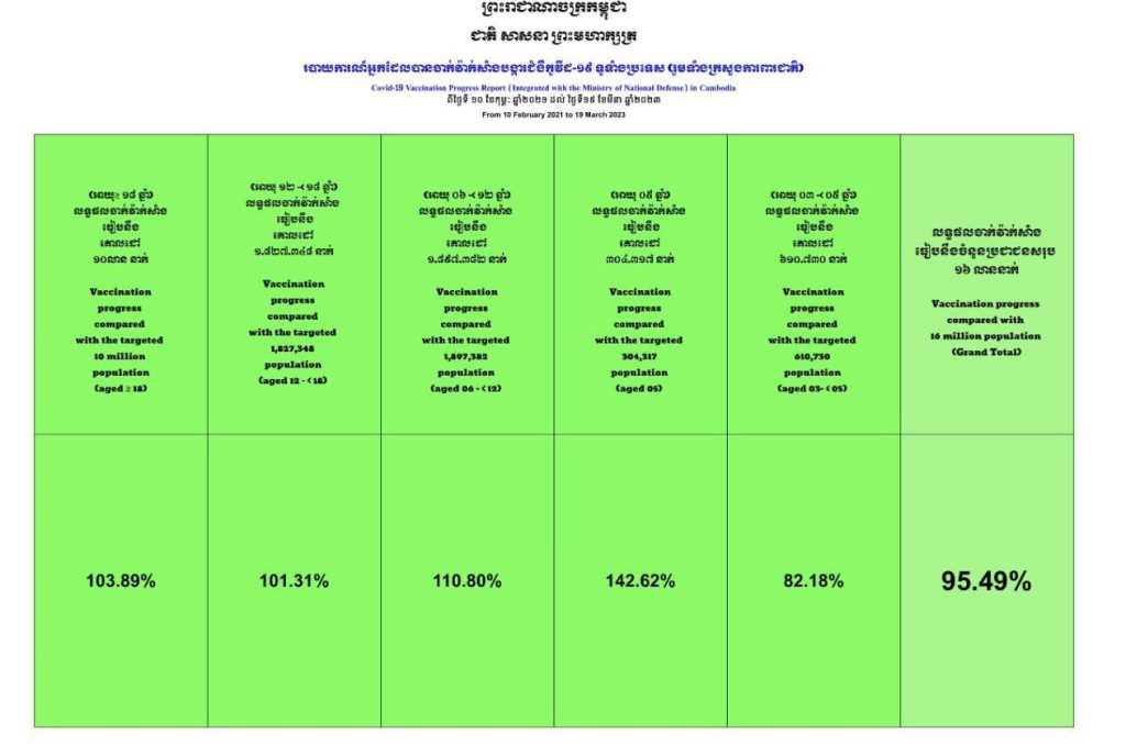 សរុបការចាក់វ៉ាក់សាំងកូវីដ១៩ទូទាំងប្រទេសបានចំនួន ១៥,២៧៨,៨១៨នាក់ គិតត្រឹមថ្ងៃទី១៩ ខែមីនា ឆ្នាំ២០២៣ម្សិលមិញ