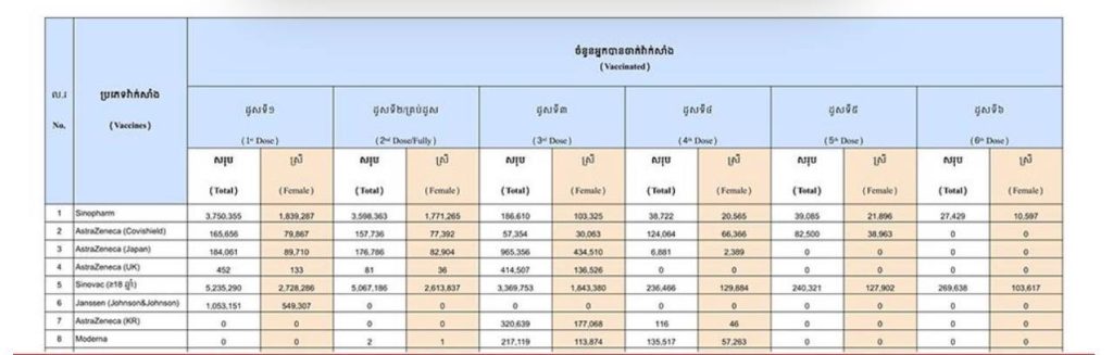 ដោយឡែកសម្រាប់អ្នកបានចាក់ដូសទី៣ចំនួន ១០,៦០៧,៦៦៥ នាក់, ដូសទី៤ចំនួន ៥,១៣៨,៥៦៧នាក់, ដូសទី៥ចំនួន ១,៧៦៨,០១៩នាក់ និងដូសទី៦ចំនួន ៣១៩,៣៧៧នាក់ ៕