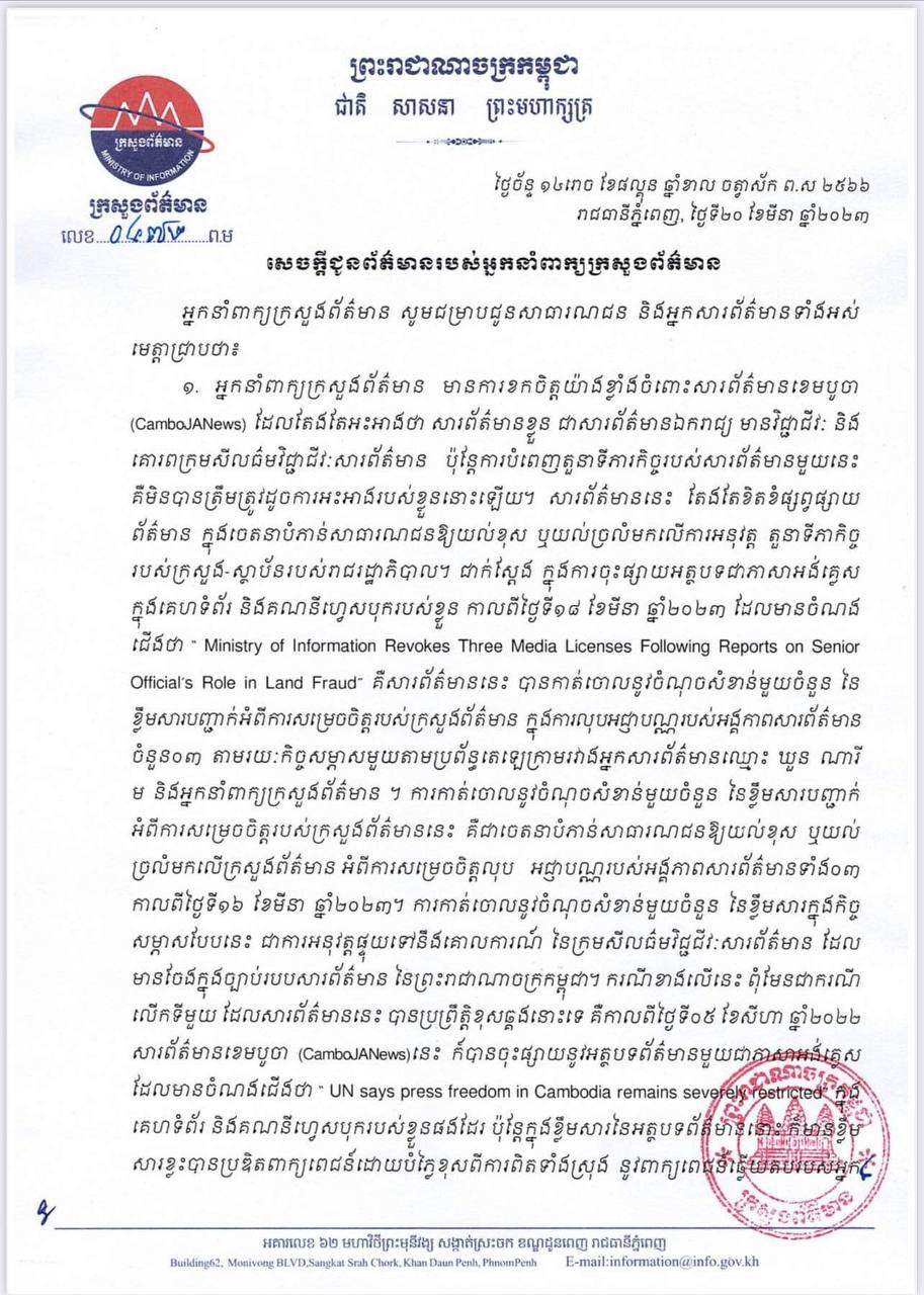 ឆ្លៀតក្នុងឱកាសនេះ អ្នកនាំពាក្យក្រសួងព័ត៌មានក៍សូមបញ្ជាក់ជូនសាធារណជន និងអ្នកសារព័ត៌មានទាំងអស់បន្ថែមផងដែរថា ការសម្រេចលុបអាជ្ញាបណ្ណអង្គភាពសារព័ត៌មានចំនួន០៣ កាលពីថ្ងៃទី១៦ ខែមីនា ឆ្នាំ២០២៣កន្លងទៅនេះ គឺដោយសារតែអង្គភាពសារព័ត៌មានទាំង០៣នោះ បានធ្វើការផ្សព្វផ្សាយព័ត៌មានមិនពិត ខ្វះការផ្ទៀងផ្ទាត់ប្រភពព័ត៌មានឱ្យបានគ្រប់ជ្រុងជ្រោយពី គ្រប់ភាគីពាក់ព័ន្ធទៅនឹងព័ត៌មាន ដែលអង្គភាពសារព័ត៌មានរបស់ខ្លួនបានធ្វើការផ្សព្វផ្សាយ ហើយអង្គភាពសារព័ត៌មានទាំង០៣នោះ មិនបានធ្វើការកែតម្រូវនូវព័ត៌មានដែលខ្លួនបានផ្សព្វផ្សាយ ខុសពីការពិតនោះឡើយ។ បន្ថែមពីនេះ កាលដែលអង្គភាពសារព័ត៌មានទាំងនោះ ខិតខំផ្សព្វផ្សាយព័ត៌មានខុសពីការពិតអំពីករណីវិវាទដីធ្លីនៅខេត្តបន្ទាយមានជ័យនេះ គឺដោយសារតែអង្គភាពសារព័ត៌មានទាំងនោះ បានទទួលការពឹងពាក់ពីភាគីម្ខាងទៀត ដោយសន្យាថានឹងផ្តល់ជាសាគុណតបស្នងវិញ ប្រសិនដោះស្រាយទំនាស់ដីធ្លីខាងលើនេះបានឈ្នះ។ ម្យ៉ាងទៀត ករណីទំនាស់ដីធ្លីនៅខេត្តបន្ទាយមានជ័យខាងលើ គឺបានបិទបញ្ចប់ ដោយមានសាលក្រមស្ថាពរពីតុលាការគ្រប់លំដាប់ ថ្នាក់រួចរាល់ផងដែរ។ ទង្វើខាងលើរបស់អង្គភាពសារព័ត៌មានទាំង០៣នោះ ជាការរំលោភបំពានយ៉ាងធ្ងន់ធ្ងរបំផុតលើគោលការណ៍ក្រុមសីលធម៌វិជ្ជាជីវៈសារព័ត៌មានដែលមានចែងក្នុងច្បាប់របបសារព័ត៌មាន នៃព្រះរាជាណាចក្រកម្ពុជា។ ដូច្នេះ ការសម្រេចលុបអាជ្ញាបណ្ណអង្គភាពសារព័ត៌មានទាំង០៣នោះ គឺផ្អែកលើការប្រមូលព័ត៌មានពិតពីភាគីពាក់ព័ន្ធ នៃករណីនេះ មិនមែនការសម្រេចលុបអាជ្ញាបណ្ណអង្គភាពសារព័ត៌មានទាំង០៣នោះ ដោយសារតែអង្គភាពសារព័ត៌មានទាំងនោះបានរាយការណ៍ព័ត៌មានប៉ះពាល់ដល់តួនាទីមន្ត្រីជាន់ខ្ពស់ក្នុងជម្លោះដីធ្លី ដូចការចុះផ្សាយរបស់សារព័ត៌មាន ខេមបូចា(CamboJANews)នោះឡើយ៕