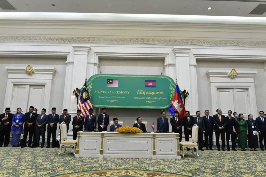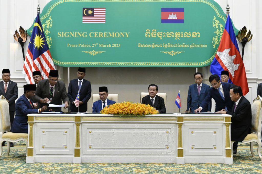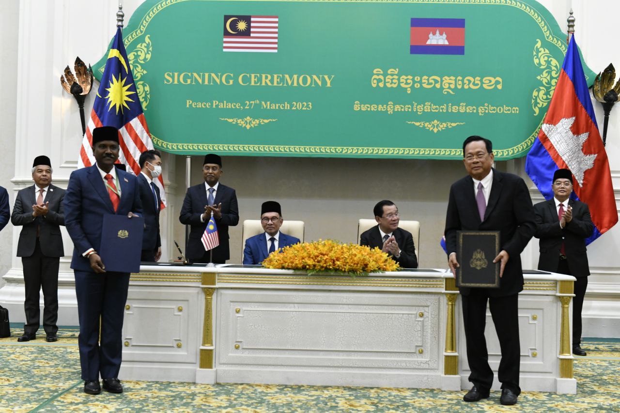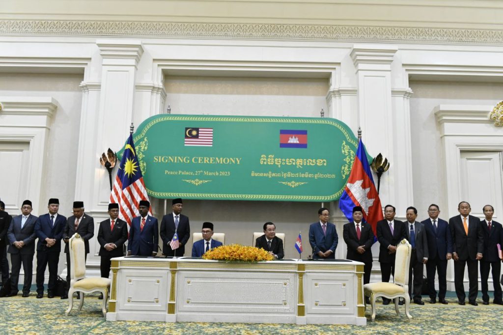 ភ្នំពេញ៖សម្តេចតេជោ ហ៊ុន សែន នាយករដ្ឋមន្ត្រីកម្ពុជា និងឯកឧត្តម ដាតុ ស៊េរី អាន់វ៉ា ប៊ីន អ៊ីប្រាហ៊ី នាយករដ្ឋមន្ត្រីម៉ាឡេស៊ី នៅវេលា ថ្ងៃត្រង់ទី២៧ ខែមីនាឆ្នាំ២០២៣ បានអញ្ជើញជាអធិបតីភាព ក្នុងពិធីចុះហត្ថលេខាលើឯកសារចំនួនពីរទាក់ ទងនឹងទាក់ទង នឹង ការជ្រើសរើសការប្រើប្រាស់និងការធ្វើមាតុភូមិនិវត្តន៍ របស់ពលករ ។