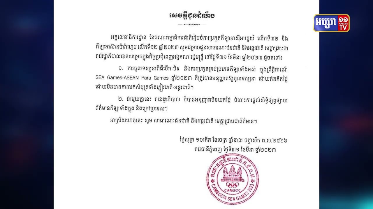 នៅថ្ងៃទី៣១ មីនា ឆ្នាំ២០២៣នេះផងដែរ គណៈកម្មាធិការជាតិរៀបចំការប្រកួតកីឡាស៊ីហ្គេម និងអាស៊ានប៉ារ៉ាហ្គេម បានជូនដំណឹងជាផ្លូវការនូវ ការអនុញ្ញាតឲ្យចូលទស្សនាការប្រកួត និងផ្តល់សិទ្ធិផ្សព្វផ្សាយដោយមិនគិតថ្លៃ។ ព្រឹត្តិការណ៍កីឡាស៊ីហ្គេម របស់កម្ពុជានឹងមកដល់ក្នុងរយៈពេល៣៥ថ្ងៃទៀតគិតត្រឹមថ្ងៃទី៣១ មីនា ឆ្នាំ២០២៣។
