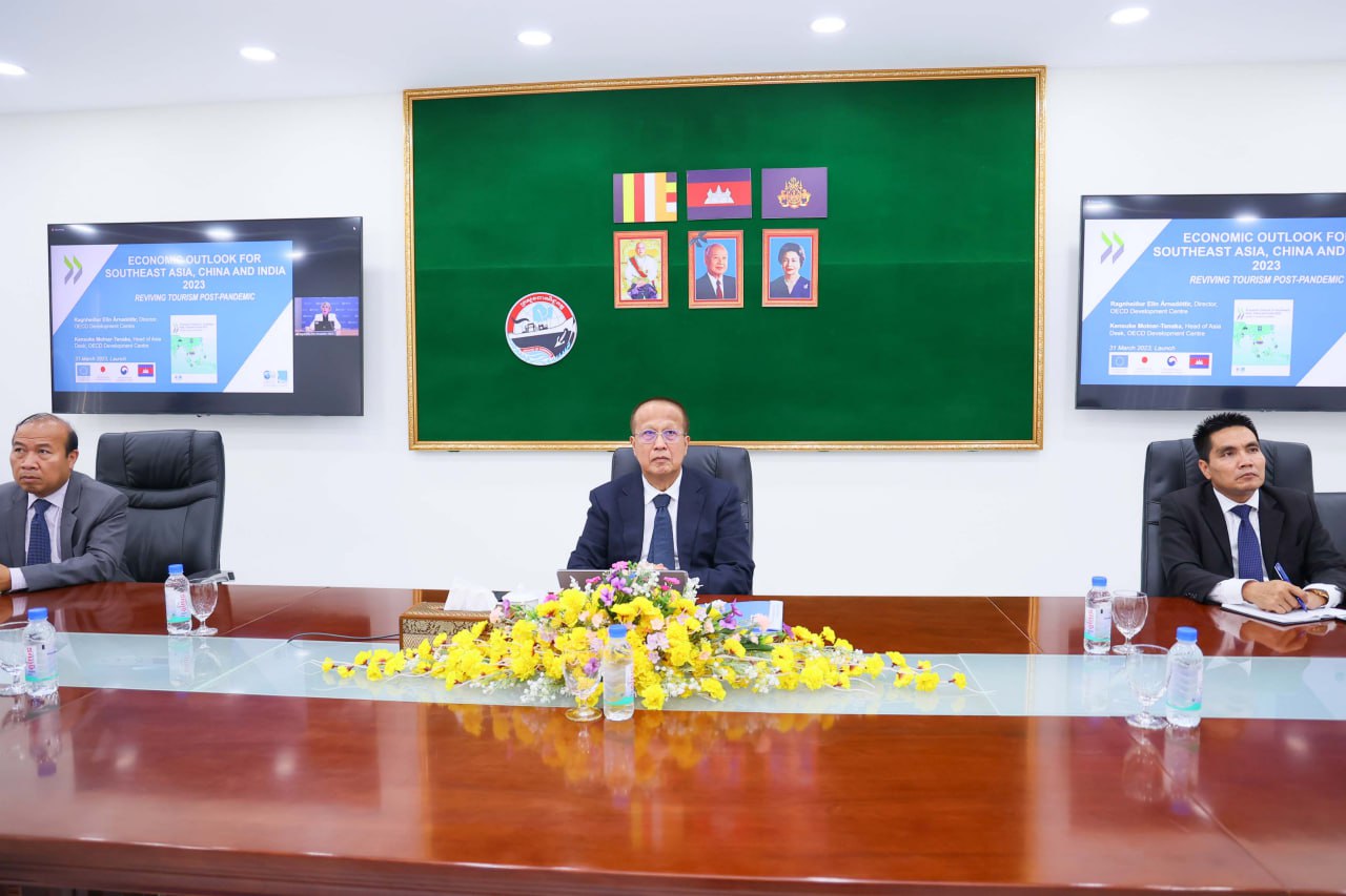(ភ្នំពេញ)៖ តបតាមការអញ្ជើញរបស់អង្គការសហប្រតិបត្តិការនិងអភិវឌ្ឍន៍សេដ្ឋកិច្ច (ហៅកាត់ថា OECD) ឯកឧត្តម ប៉ាន សូរស័ក្តិ រដ្ឋមន្ត្រីក្រសួងពាណិជ្ជកម្ម បានផ្តល់កិត្តិយសអញ្ជើញចូលរួមថ្លែងសុន្ទរកថាបើក ក្នុងកម្មវិធីសម្ពោធព្រឹត្តិបត្រព្យាករណ៍សេដ្ឋកិច្ចសម្រាប់តំបន់អាស៊ីអាគ្នេយ៍ ចិន និងឥណ្ឌា ឆ្នាំ២០២៣ ដែលបានប្រព្រឹត្តទៅ នារសៀលថ្ងៃទី៣១ ខែមីនា ឆ្នាំ២០២៣ តាមប្រព័ន្ធវីដេអូ ក្រោមមូលបទ “ការងើបឡើងវិញនៃវិស័យទេសចរណ៍ក្រោយពីជំងឺរាតត្បាតសកល” (“The 2023 OECD Economic Outlook for Southeast Asia, China and India: Reviving Tourism Post-Pandemic”) ។