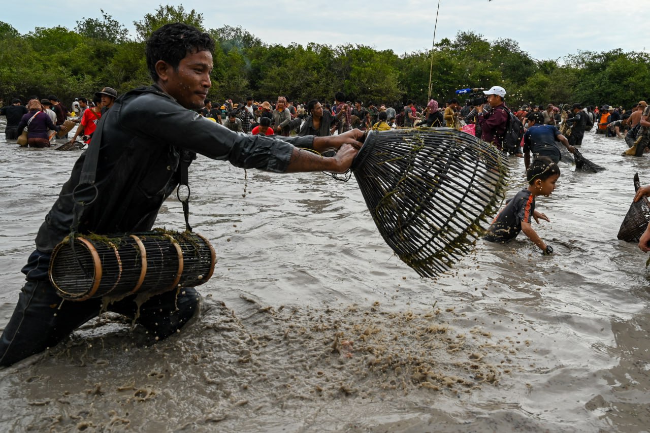 ត្បូងឃ្មុំ៖ អ្នកភូមិនៅភាគខាងកើតនៃប្រទេសកម្ពុជា នាំគ្នារត់ចូលទៅក្នុងបឹងភក់មួយកន្លែង ដែលមានជម្រៅជ្រៅ ដោយប្រើប្រាស់កន្ត្រក និងអួនដើម្បីចាប់ត្រី ដែលនេះជាផ្នែកមួយនៃពិធីបុណ្យនេសាទតាមបែបប្រពៃណីប្រចាំខេត្តត្បូងឃ្មុំ។