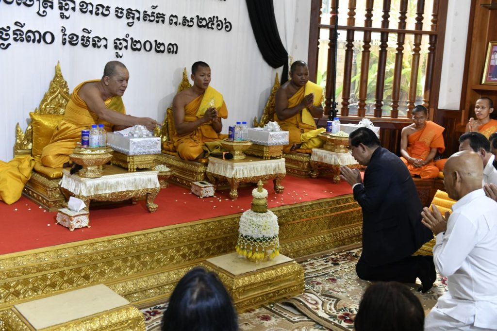 ភ្នំពេញ៖ សម្តេចអគ្គមហាសេនាបតីតេជោ ហ៊ុន សែន នាយករដ្ឋមន្រ្តី នៃព្រះរាជាណាចក្រកម្ពុជា នៅរសៀលថ្ងៃទី៣១ ខែមីនា ឆ្នាំ២០២៣ អញ្ជើញគោរពវិញ្ញាណក្ខន្ធសពលោកតាឧបាសក ឌី បូ ត្រូវជាឪពុកមាបង្កើតរបស់សម្តេចតេជោនាយករដ្ឋមន្រ្តី ដែលតម្កល់ធ្វើបុណ្យទក្ខិណានុប្បទាតាមប្រពៃណីព្រះពុទ្ធសាសនា នៅគេហដ្ឋានលេខ៤១-៤៣ ផ្លូវ២៦៥ សង្កាត់ទឹកល្អក៣ ខណ្ឌទួលគោក រាជធានីភ្នំពេញ។ នៅចំពោះមុខរូបថត នៃមជ្ឈូសតម្កល់សព សម្តេចតេជោនាយករដ្ឋមន្រ្តី បានលំឱនកាយវាចាចិត្តដោយសេចក្តីគោរពកតញ្ញូតាធម៌ដ៏ជ្រាលជ្រៅបំផុត ចំពោះវិញ្ញាណសពលោកតាឧបាសក ឌី បូ ត្រូវជាឪពុកមាដែលបានធ្វើកម្មកិរិយាលាចាកលោកយើងនេះ ទៅកាន់លោកខាងមុខ ក្នុងជន្មាយុ ១០២ឆ្នាំ ដោយជរាពាធ។